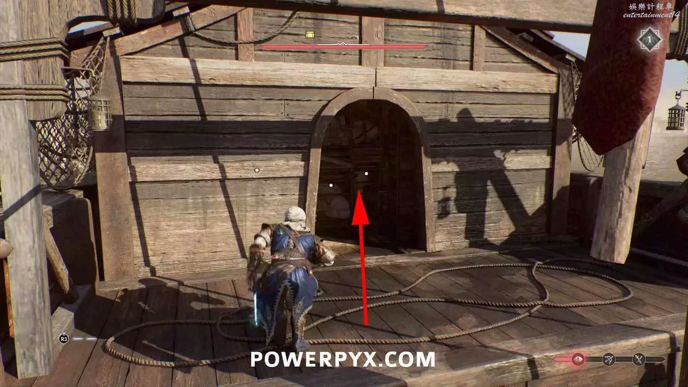 在上灣區港口的船上,進入船長室可以看到一個擋路的架子,右轉翻過2個疊起來的箱子。將架子從入口處一直往前推到裝備箱所在位置,然後將右側架子拉向自己以打開左側通路,走左側通路再走右邊架子後方的路,這裡會遇到另一個架子,把新遇到的架子拉向自己所在方向,從架子後面沿路前進,再次遇到一個架子並把它拉向自己的方向,返回入口處即可開啟通往裝備箱的路。