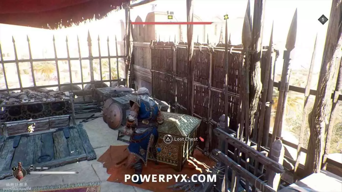 在大軍營內,爬梯子登上西邊牆壁,往裝備箱所在的方向走,打碎可移動架子左側的罐子,然後向左移動架子。擊敗敵人後開啟箱子即可。