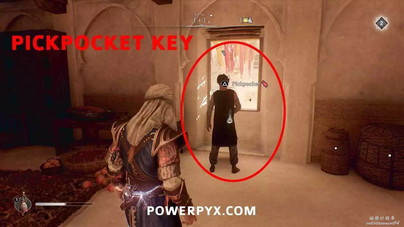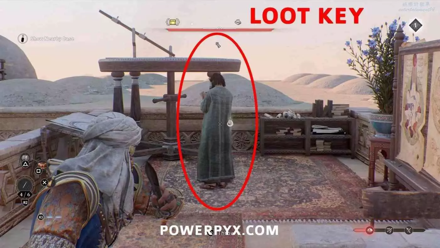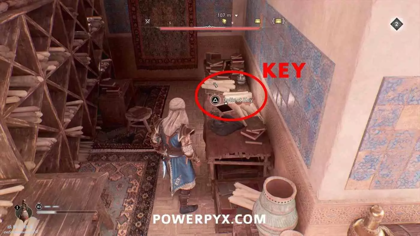 在智慧宮東北邊屋頂上的一名NPC處偷到鑰匙(具體位置在地圖裝備箱圖示東北方向大約50米處),靠近NPC後按十字鍵左掃描,頭上會顯示一個白色放大鏡標記,沒偷成功的話就擊殺他然後搜刮屍體。
