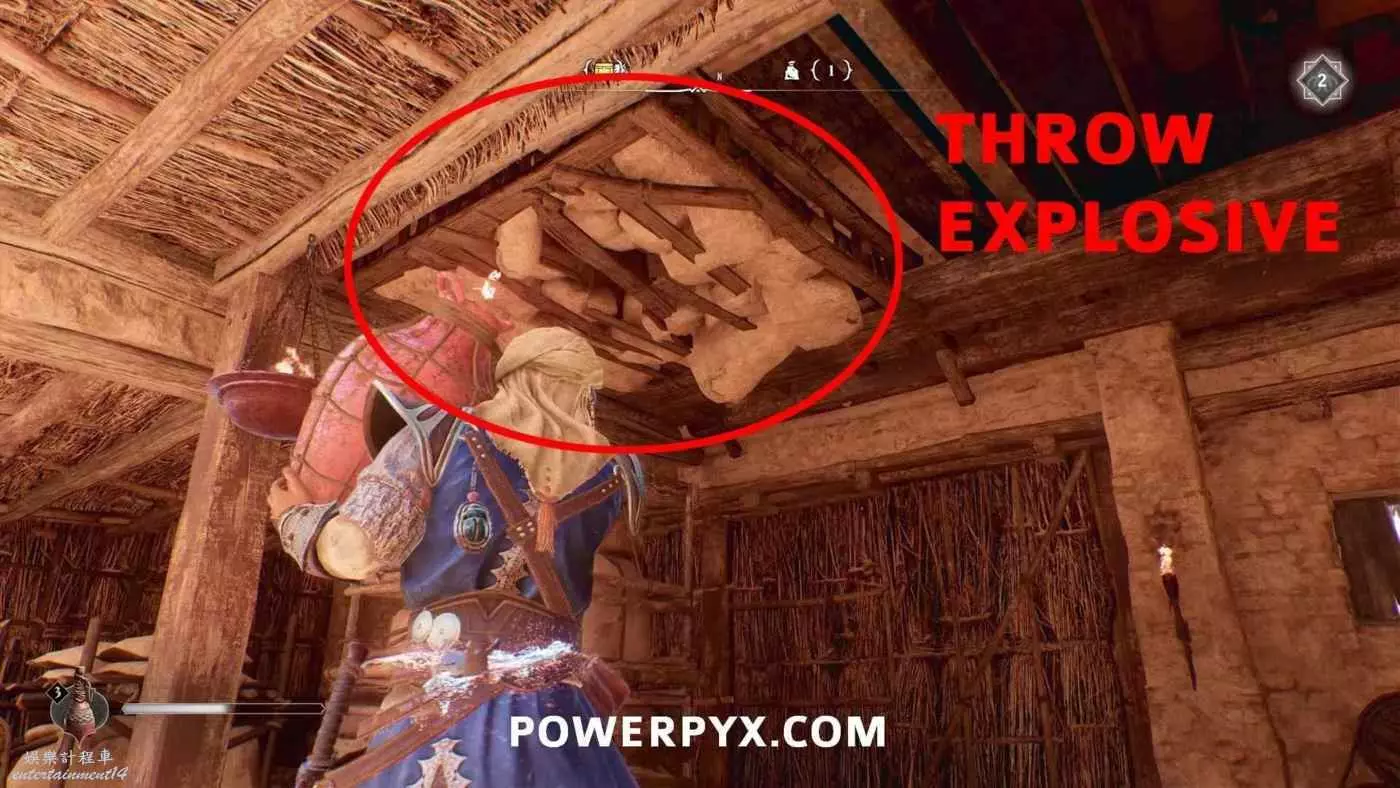 然後這個房間裡還有一塊可以破壞的天花板,從儲藏室拿起另一個炸藥桶朝房頂扔,或爬上外牆用飛刀引爆樓上的炸藥桶。