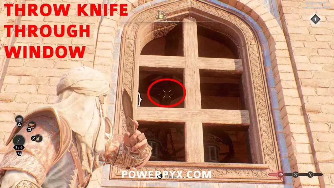 用鑰匙開門,上層可以看到一塊可破壞的木板,爬上塔樓北側快到頂端的位置找到一扇開著的窗戶,用飛刀擊中屋內吊燈,這樣吊燈會落在爆炸罐上,從而炸掉木板。