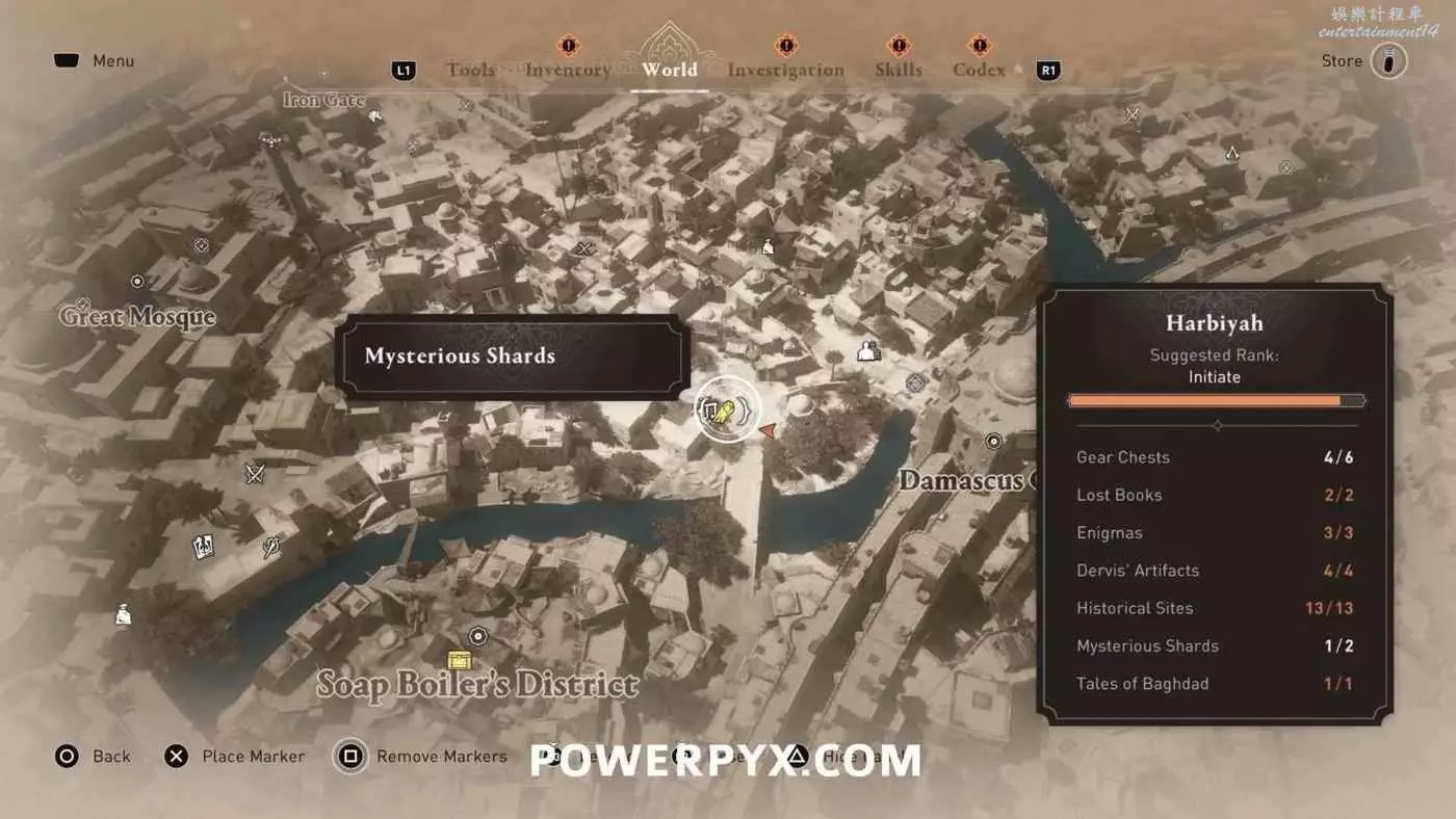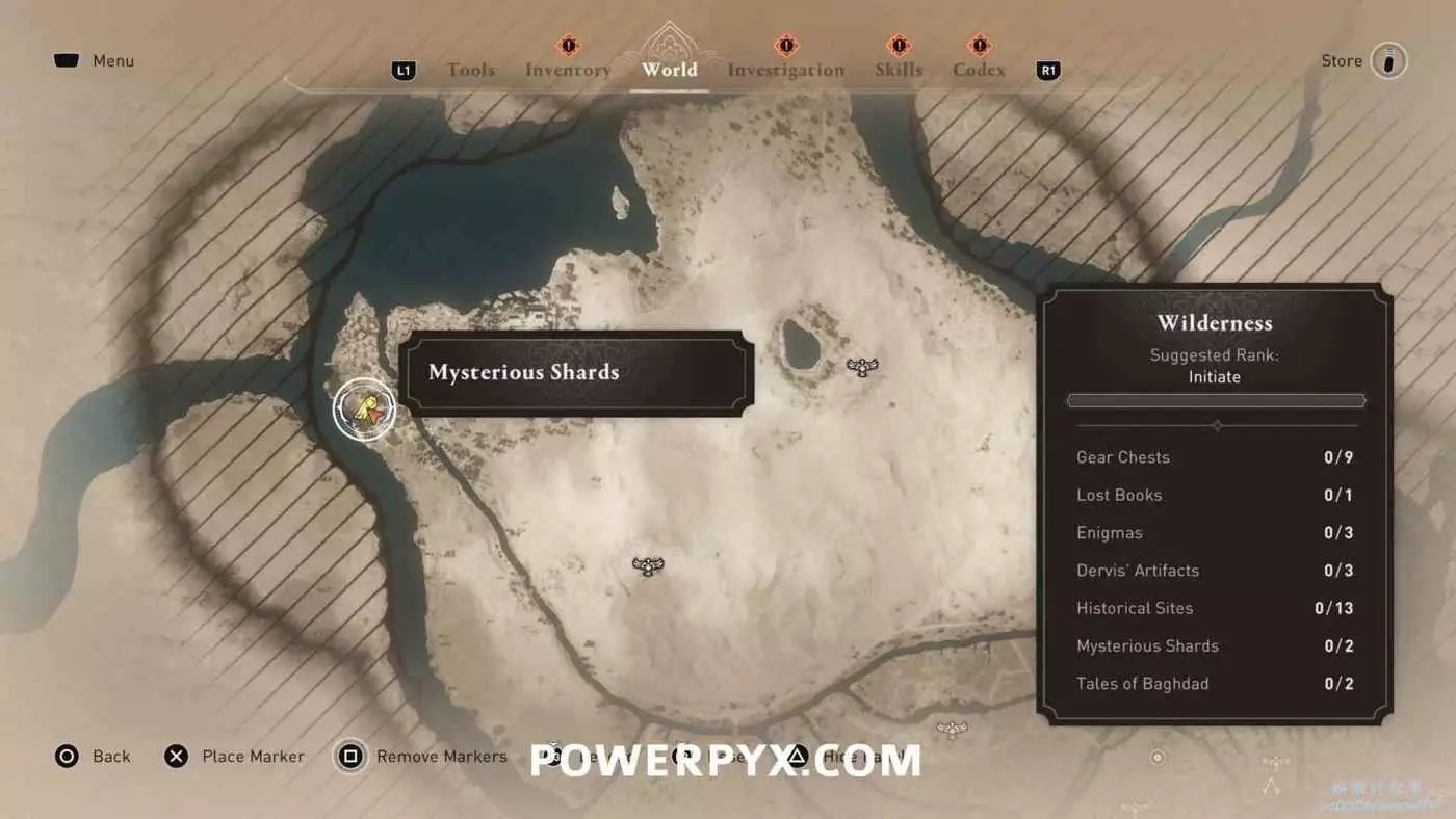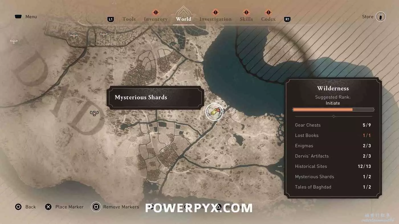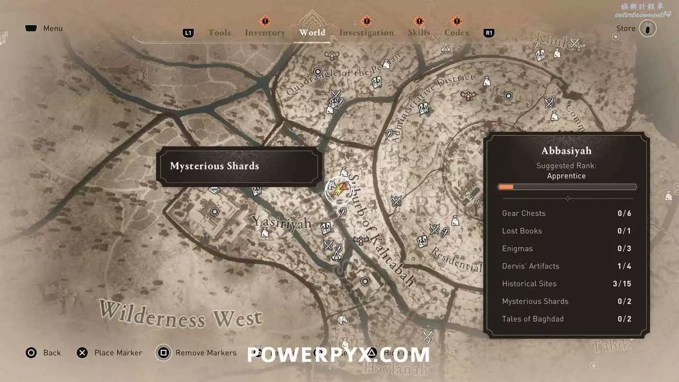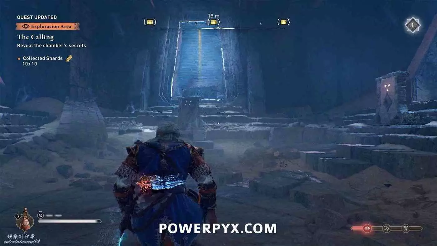 收集所有碎片後,前往安巴爾(初始城鎮)東部荒野的【綠洲北部】(位置如下圖所示),潛入綠洲的湖中,沿著水下隧道一直走到盡頭可以發現一間隱藏密室。這裡有3個可以放入神秘碎片的底座,總共需要放入10個碎片。