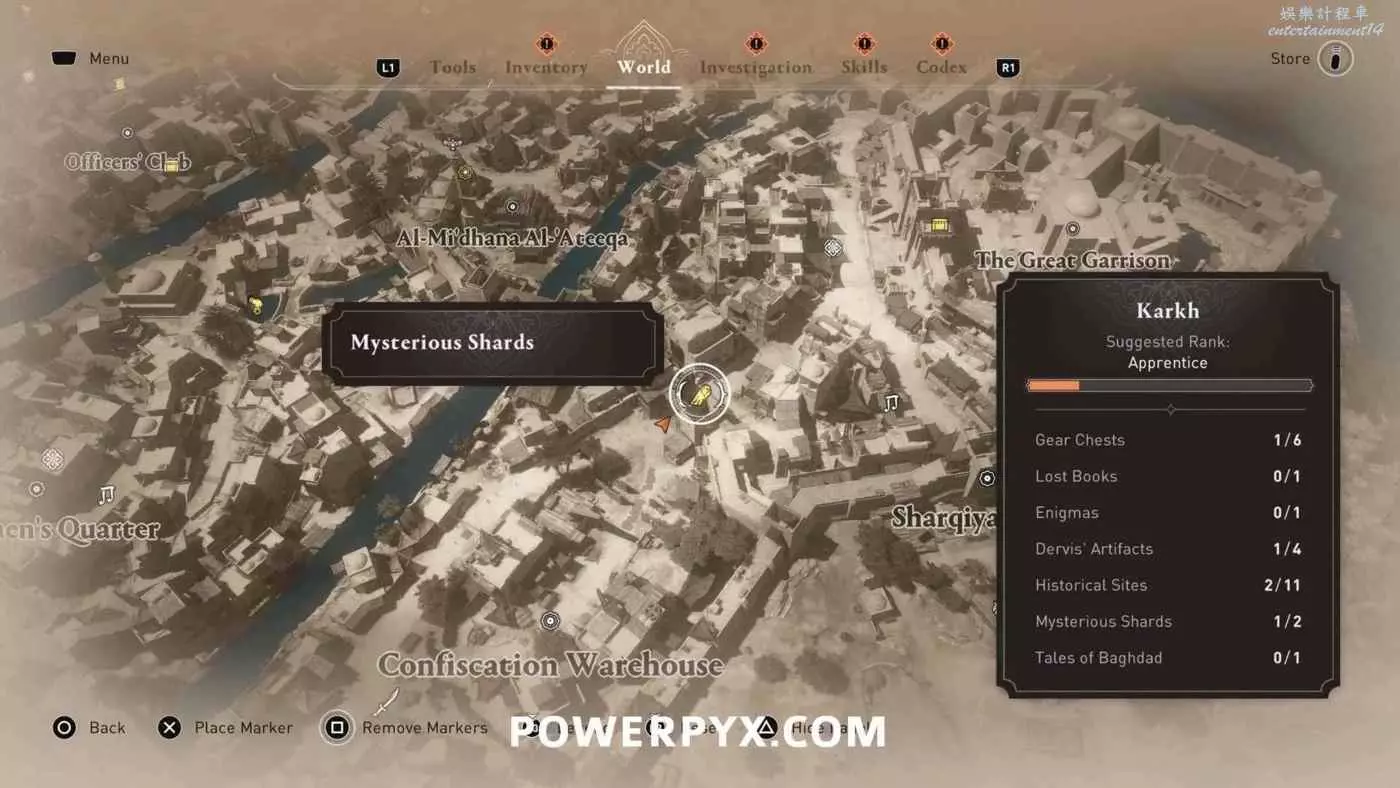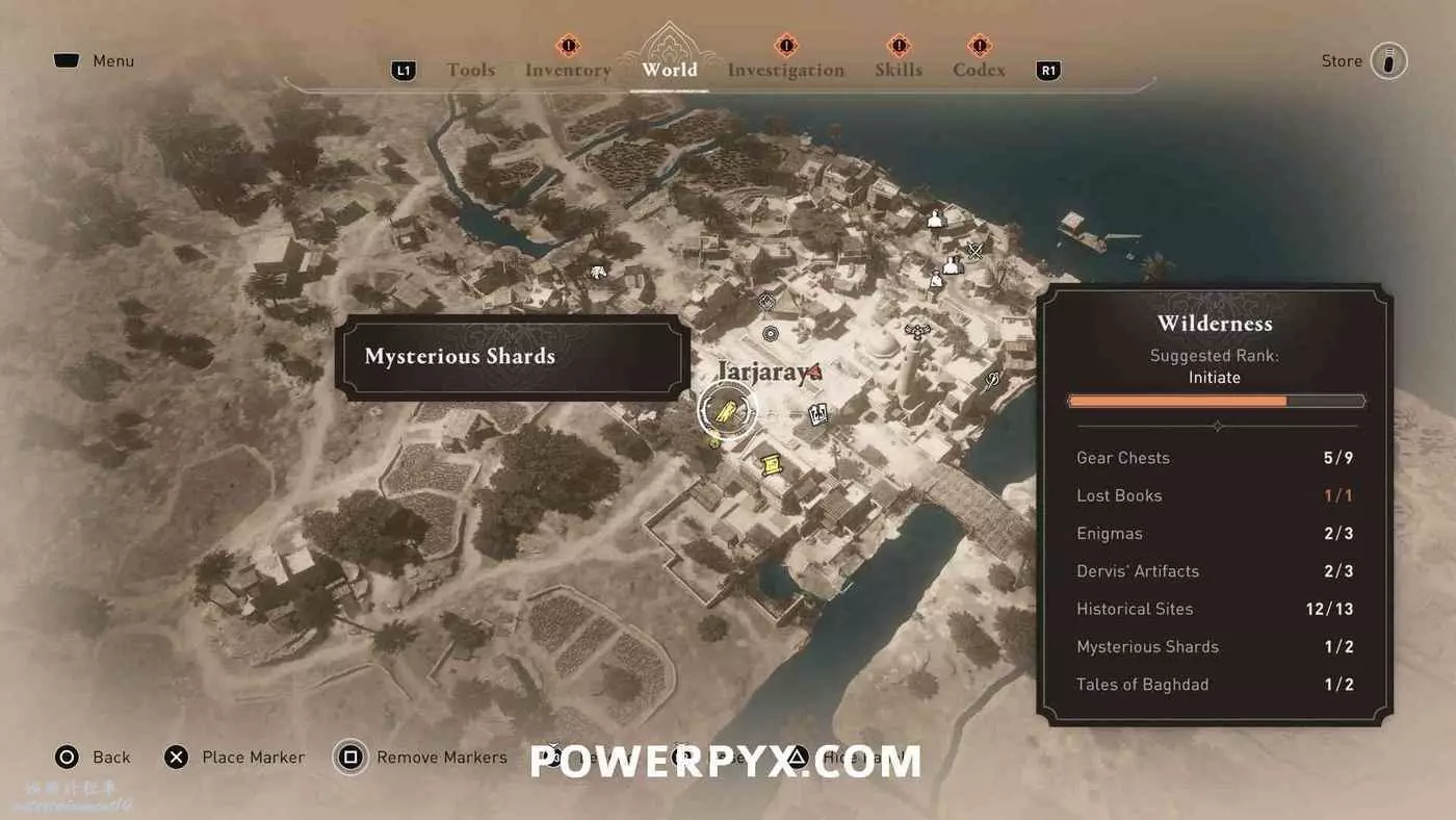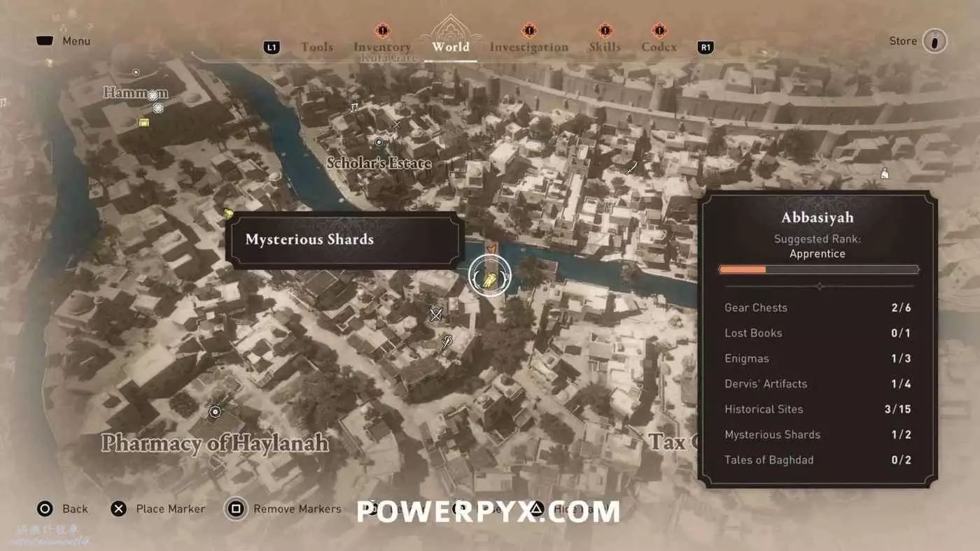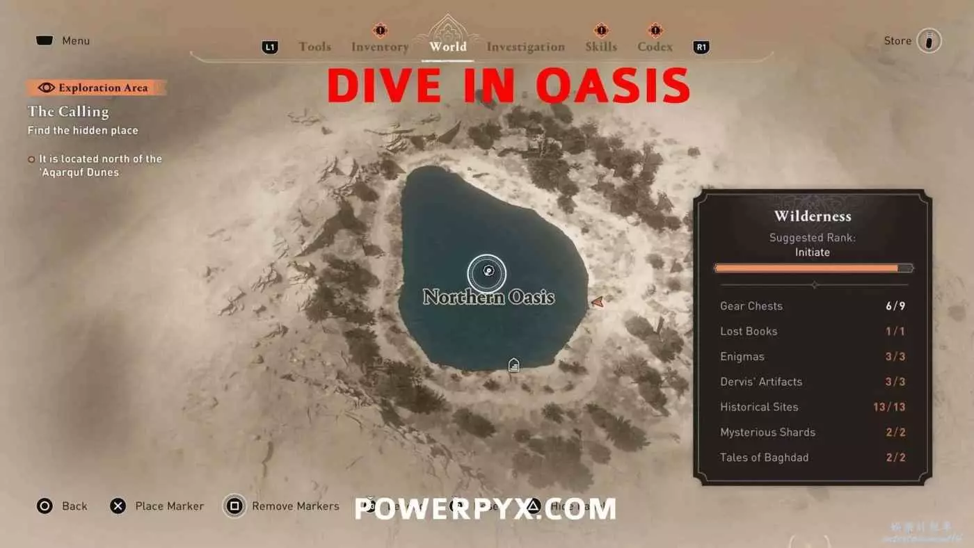 收集所有碎片後,前往安巴爾(初始城鎮)東部荒野的【綠洲北部】(位置如下圖所示),潛入綠洲的湖中,沿著水下隧道一直走到盡頭可以發現一間隱藏密室。這裡有3個可以放入神秘碎片的底座,總共需要放入10個碎片。