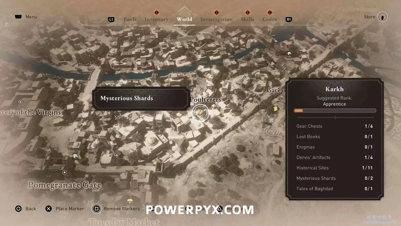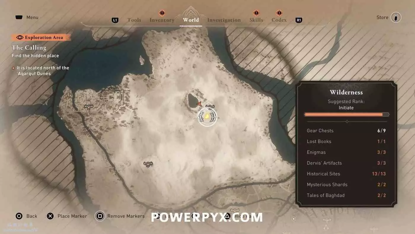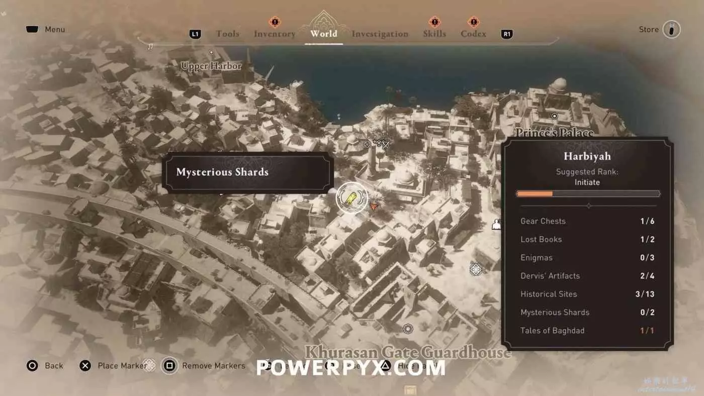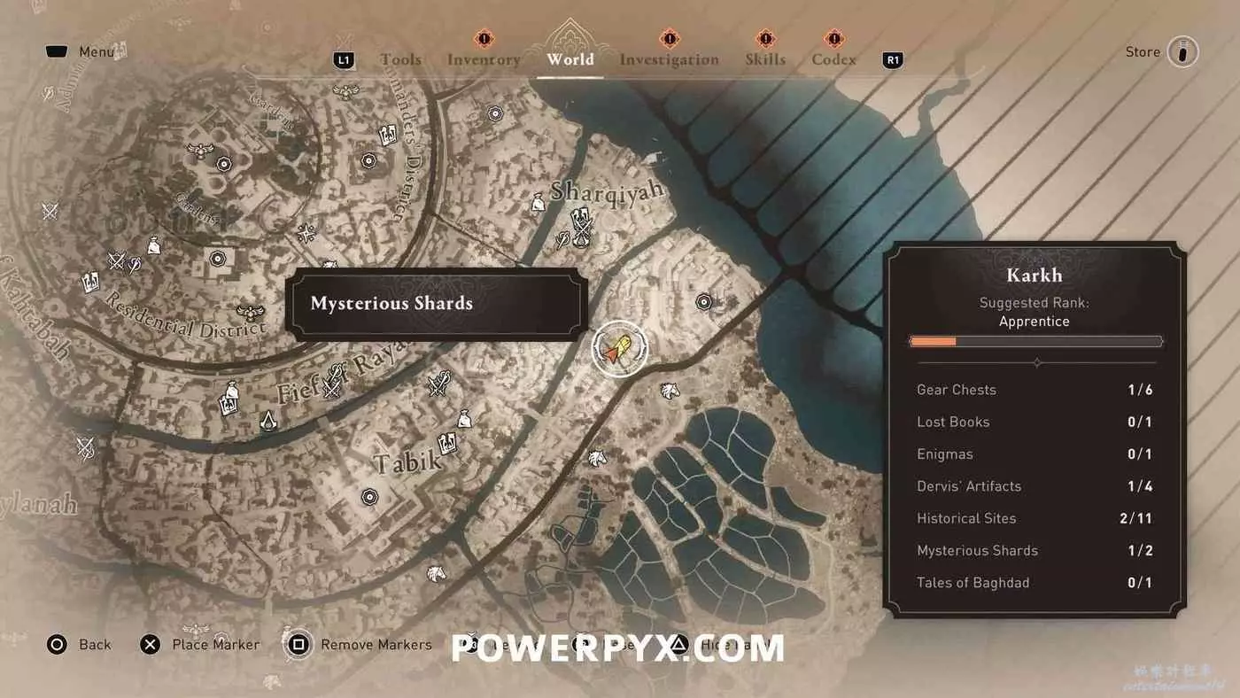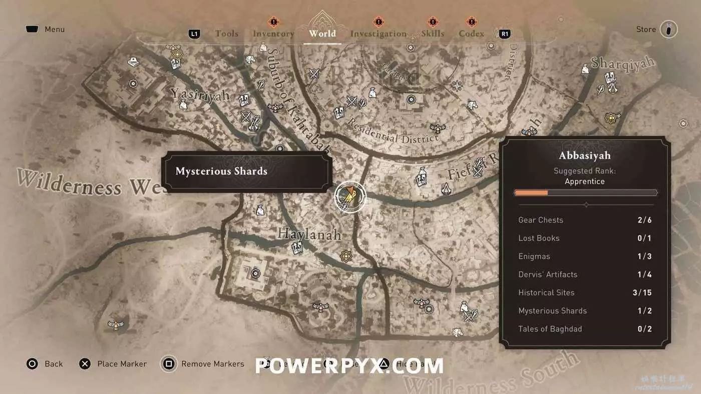收集所有碎片後,前往安巴爾(初始城鎮)東部荒野的【綠洲北部】(位置如下圖所示),潛入綠洲的湖中,沿著水下隧道一直走到盡頭可以發現一間隱藏密室。這裡有3個可以放入神秘碎片的底座,總共需要放入10個碎片。
