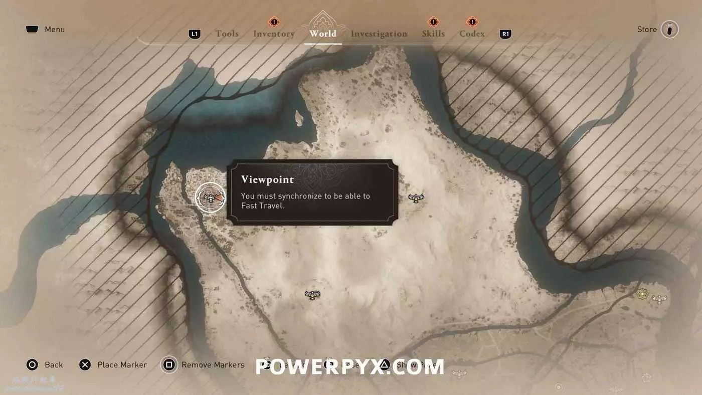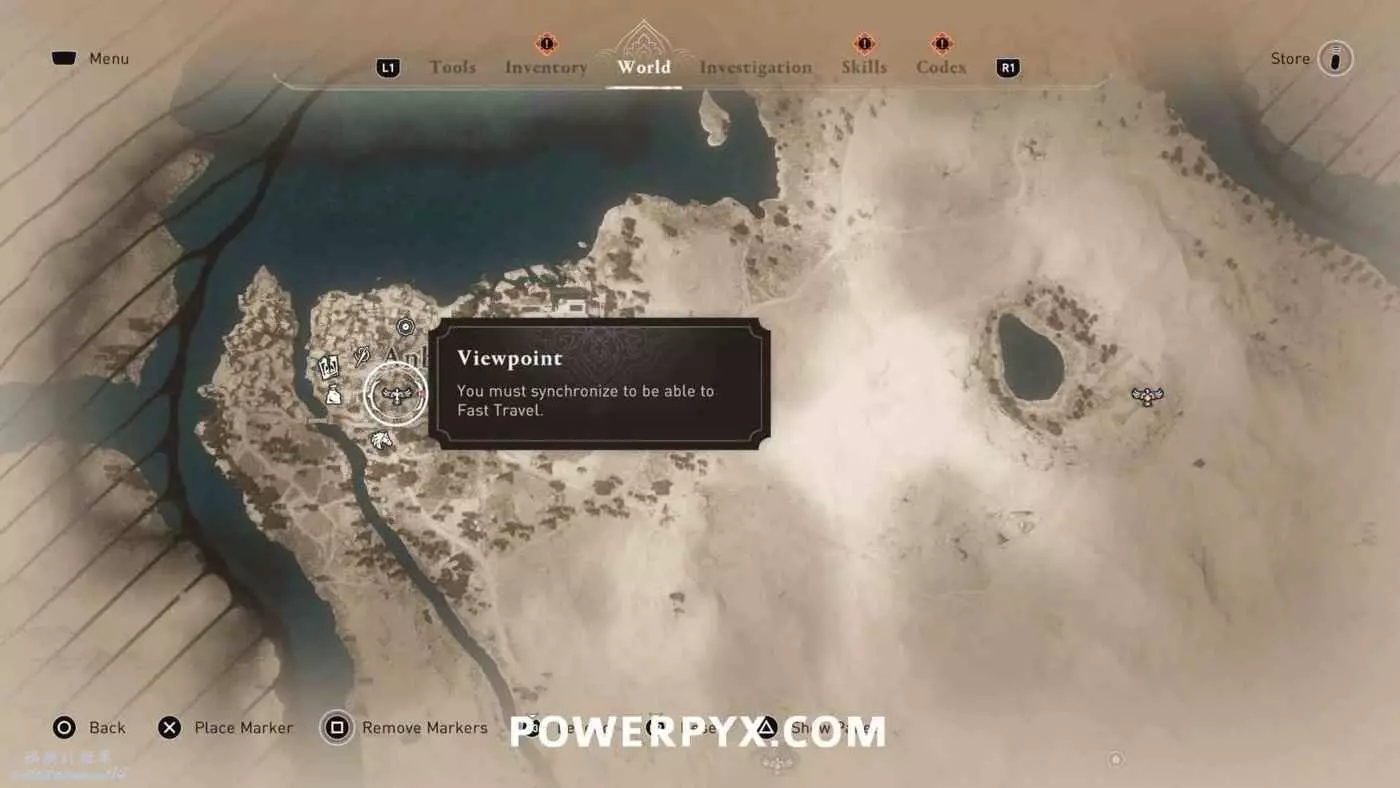 俯瞰點(鳥瞰點)是本作中的傳送點,在俯瞰點同步後可以消除地圖上的迷霧並顯示收集品,多為可以攀爬的高大建築物。完成序章並解鎖坐騎系統後即可使用俯瞰點。建議儘早同步這些俯瞰點,這樣就可以在接下來的劇情中使用。所有俯瞰點都不用擔心漏掉,通關主線劇情後依然可以自由探索前往解鎖。