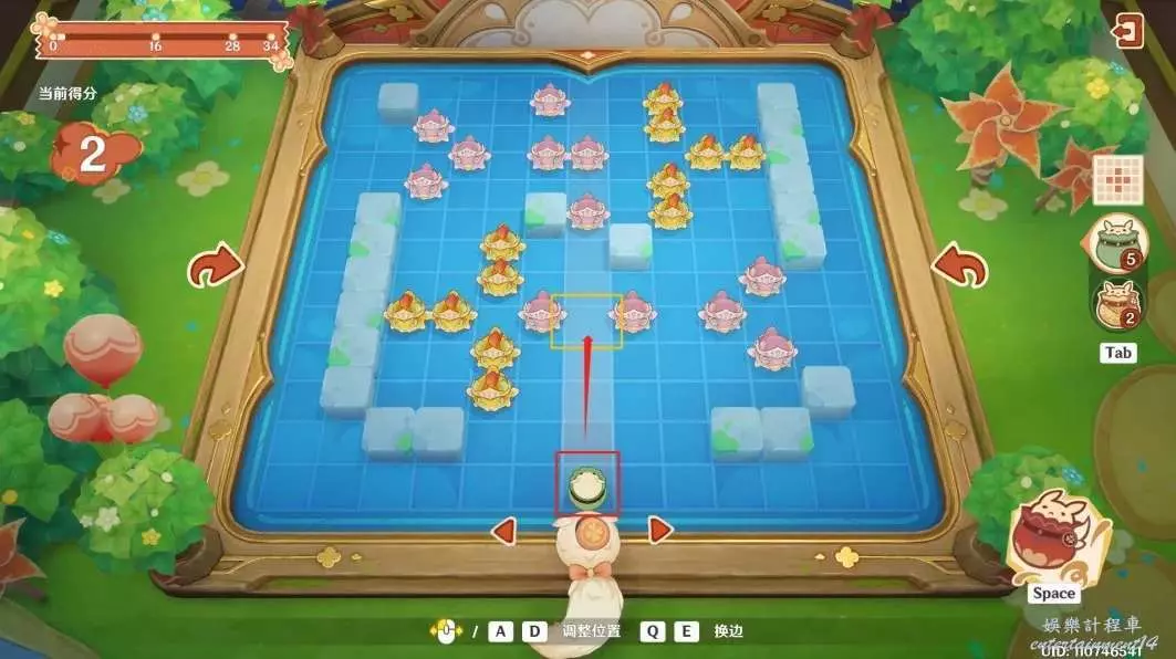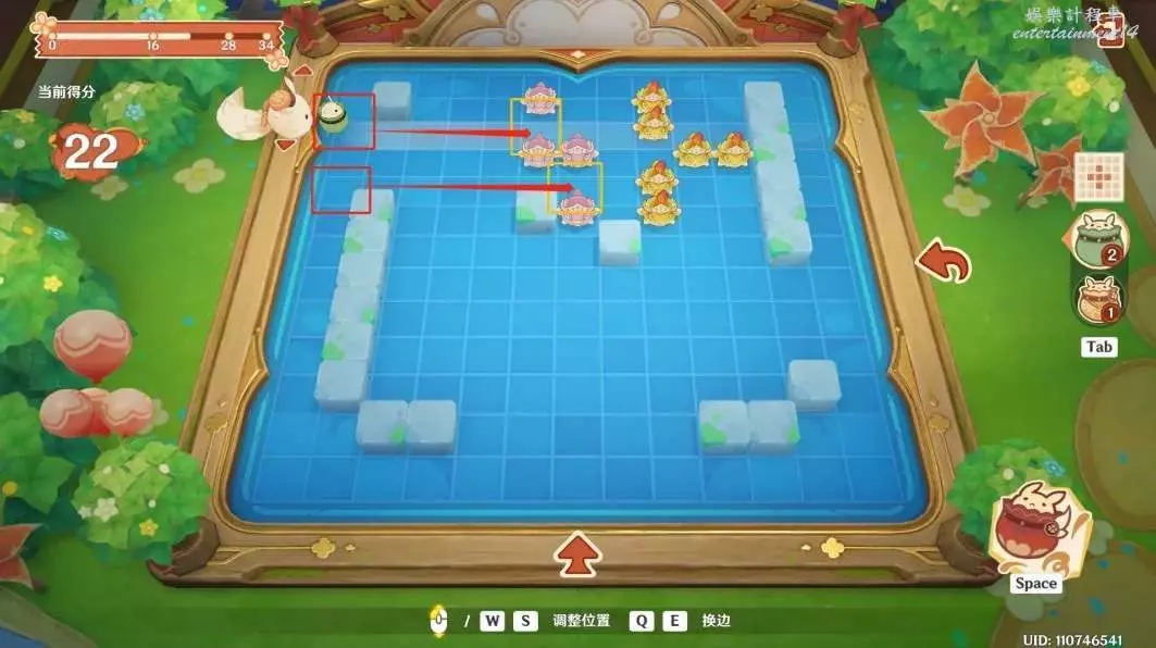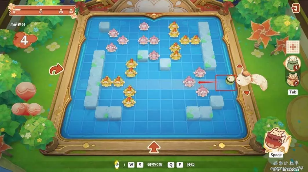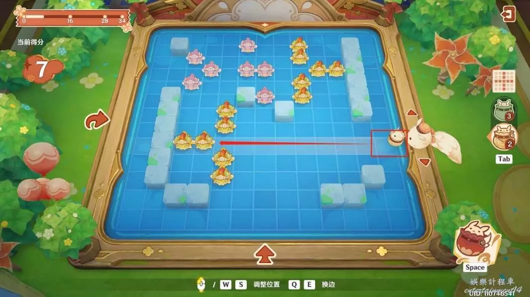 在上圖所示的兩個紅色框框位置使用綠色炸彈,在黃色框框位置引爆(發射炸彈後再次點擊發射鍵引爆炸彈)。清空掉路徑上的4條紫魚。(拿4分)