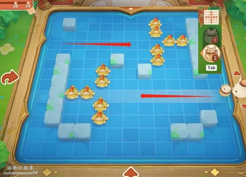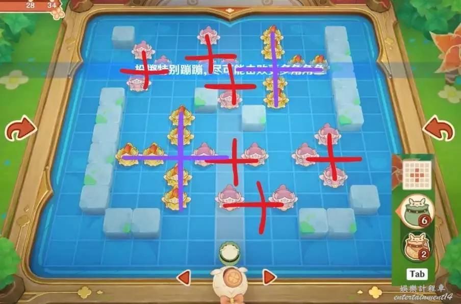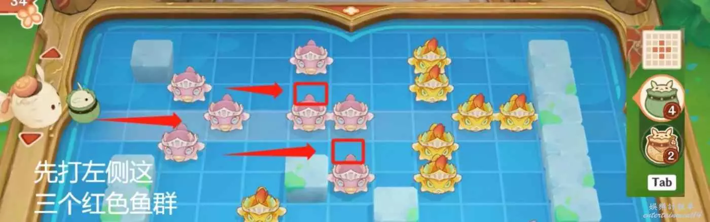 按圖中的序號發射蹦蹦,右側魚群需要切換到右側位置再發射