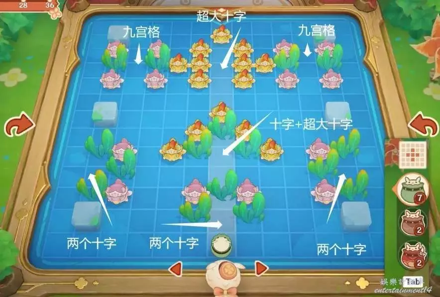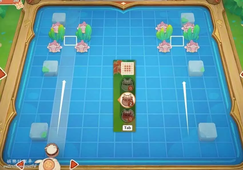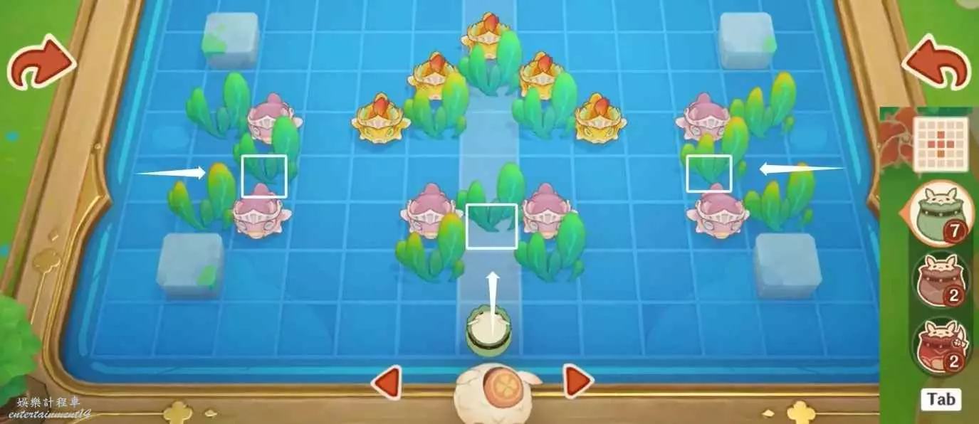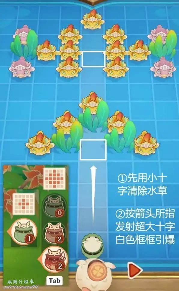 同樣是從箭頭所指的路徑發射蹦蹦,首先要用十字範圍蹦蹦清除水草