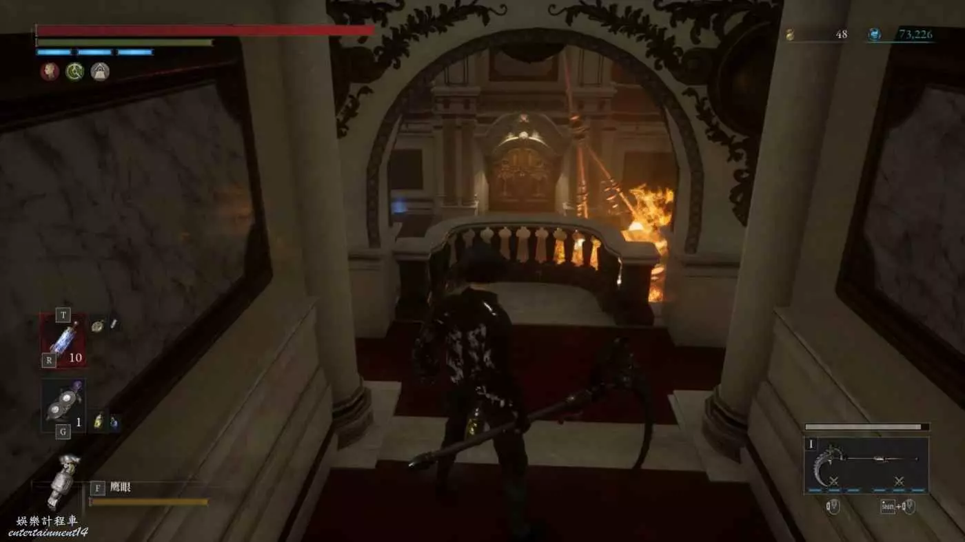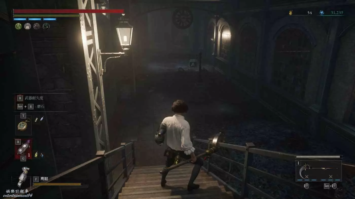 在探索伊莎貝拉劇院前,在酒店買下蘋果;然後進入伊莎貝拉劇院右轉上樓來到下圖位置,即能夠在高處看到搖擺吊燈的地方,左轉開門即可找到這個NPC(右轉是寶箱),多次對話給她蘋果。