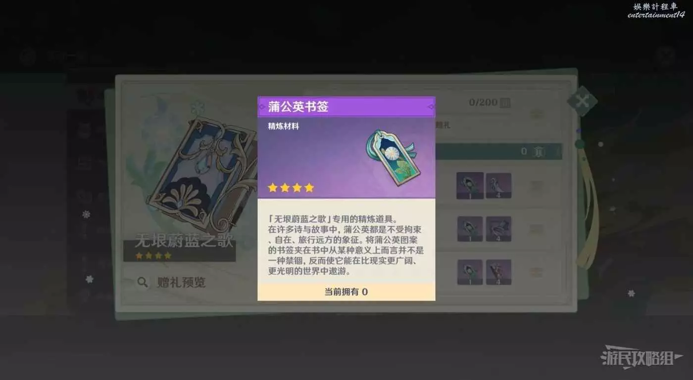 原神 (Genshin Impact) 限定武器無垠蔚藍之歌精煉方法 12 10 月 2023-10-12 廣告 作者:瑞破受氣包 來源:遊民星空 4星法器【無垠蔚藍之歌】可以通過使用活動專屬武器精煉材料【蒲公英書簽】來精煉。【蒲公英書簽】可以通過參與活動「游水醞詩籍」並在詩歌會熱度分別達到400/600/800/1000後獲得。 在活動介面可以查看當前詩歌會熱度,達到後在熱度介面領取即可。