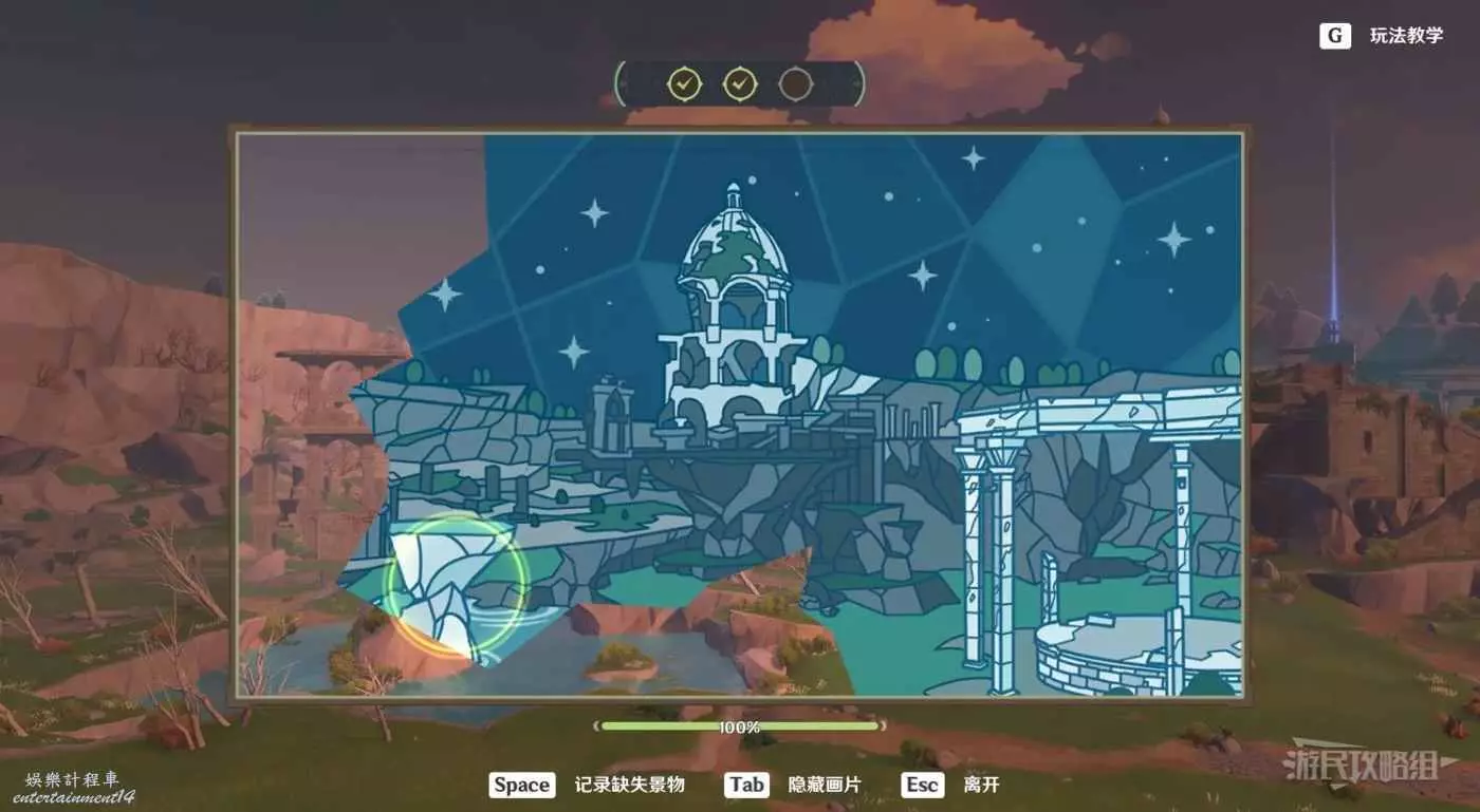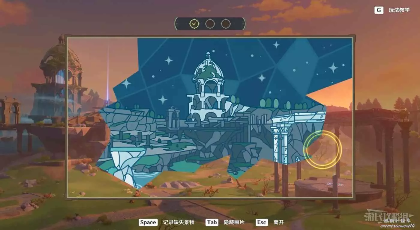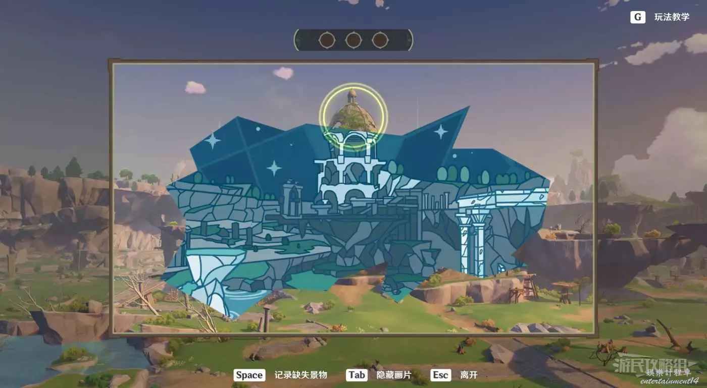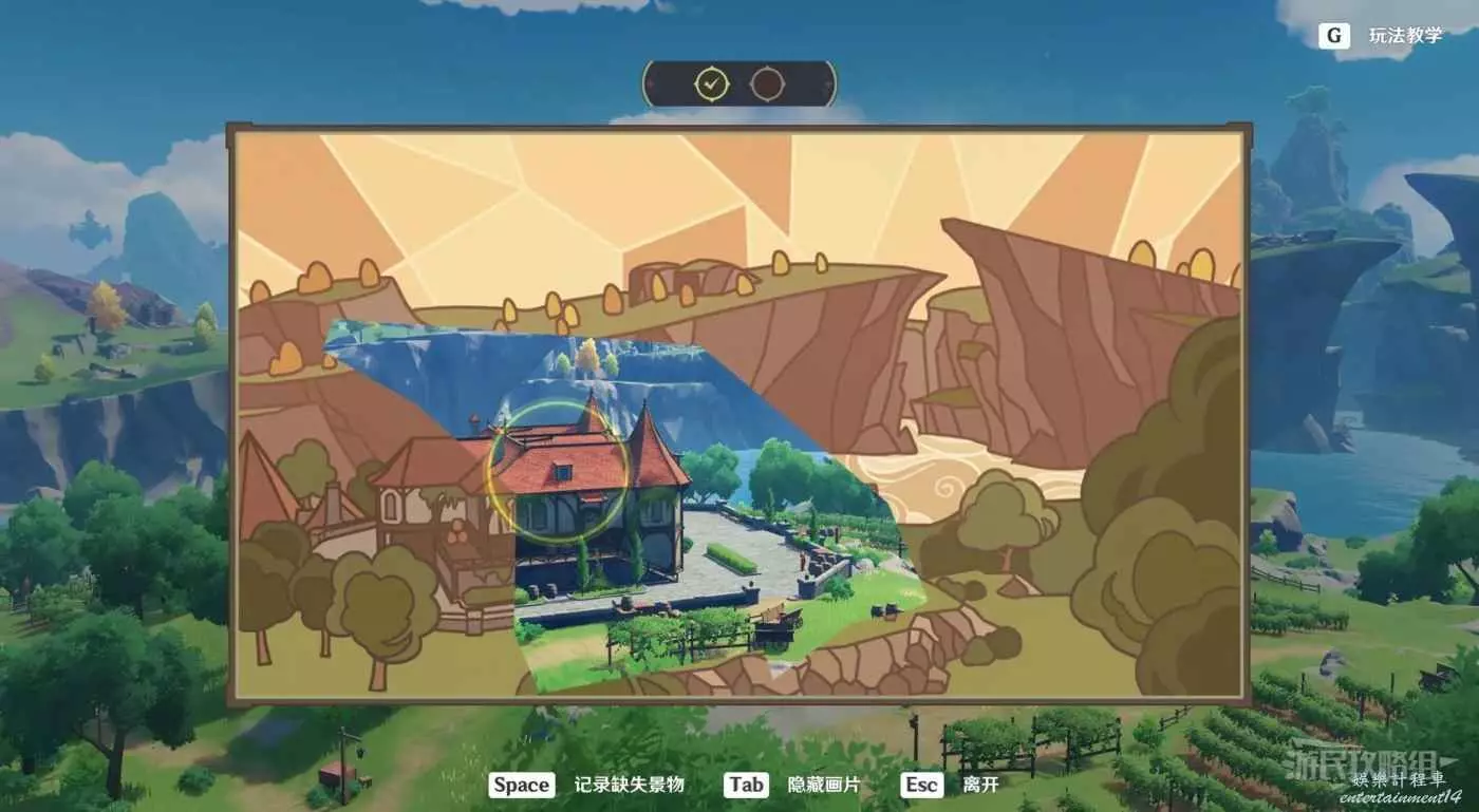 參考下圖調整角度。首先視角往右對準遠處山崖。