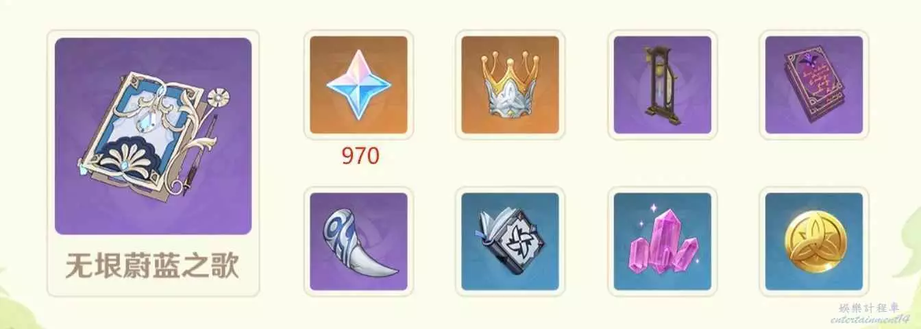 完成各個玩法,可獲得「詩歌會熱度」。詩歌會熱度達到指定值可以獲得無垠蔚藍之歌(活動絕版武器)、智識之冕、活動專屬武器精煉材料等獎勵。