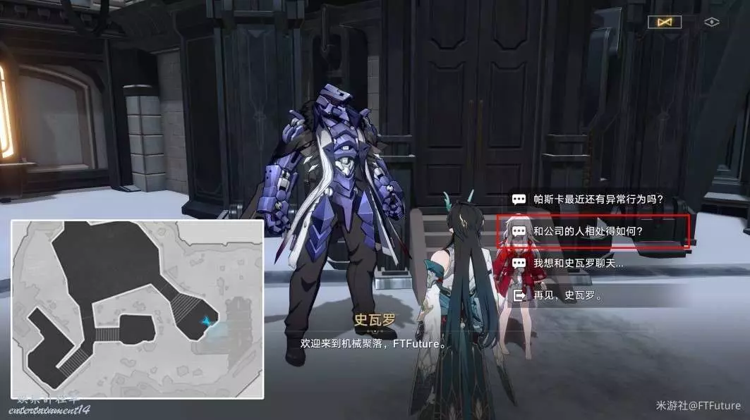完成開拓續聞任務「未來市場」後,到雅利洛-Ⅵ的「機械聚落」2層東南邊下圖所示位置,與史瓦羅對話,選擇「和公司的人相處的如何?」,完成劇情後即可獲得此成就。