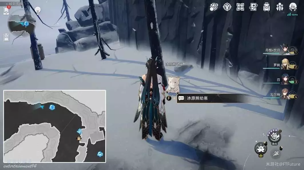 完成開拓續聞任務「未來市場」後,到雅利洛-Ⅵ的「城郊雪原」下圖所示位置,與冰原熊幼崽互動即可。