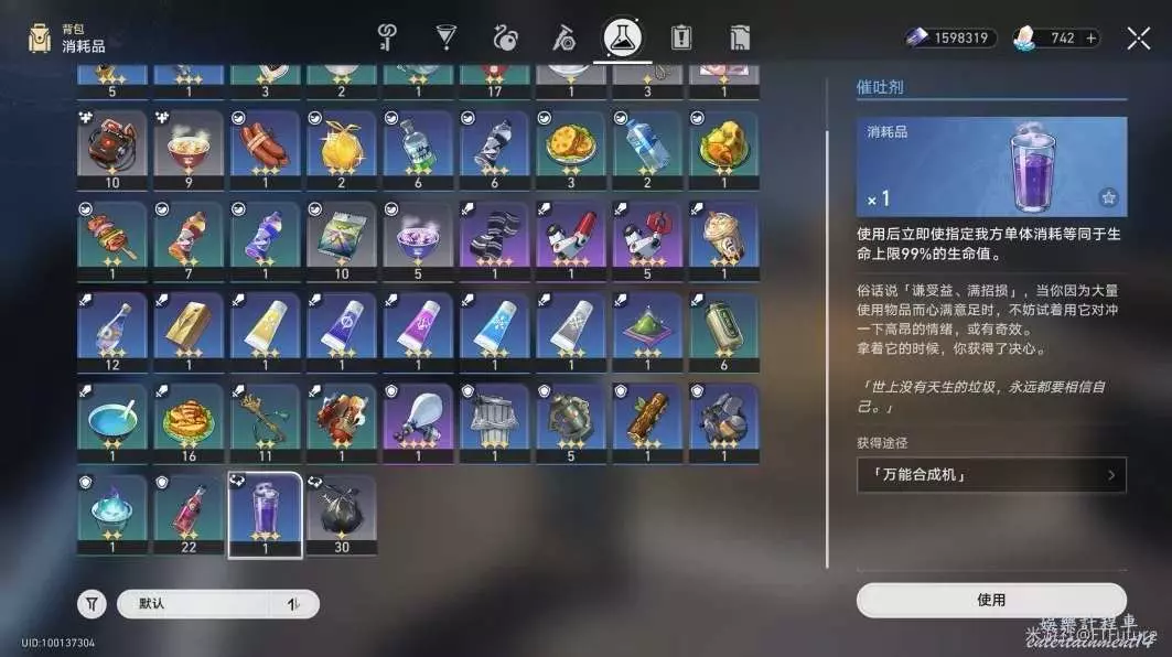 第二步:給隊友使用「催吐劑」,將血量降至1%,並確保不要帶開局有回血效果的光錐或角色,例如存護光錐「我們是地火」、角色羅刹等;