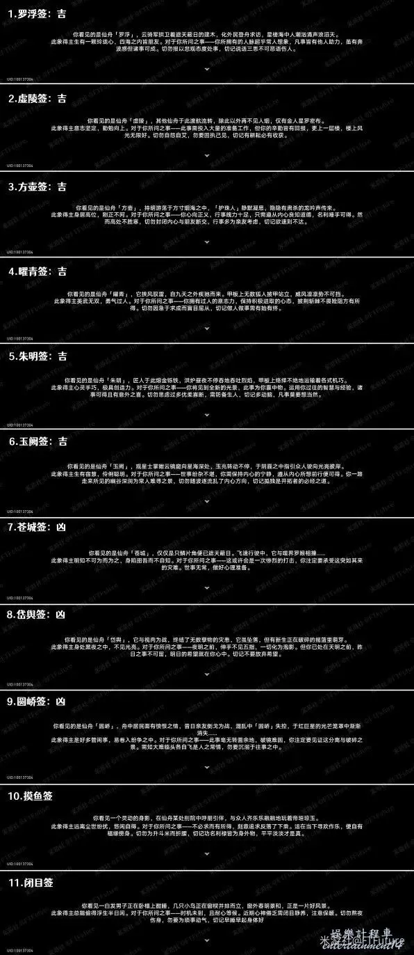 占卜共有11種結果,6種吉簽,3種凶簽,1種摸魚簽,1種閉目簽,抽到對應簽文即可獲得對應成就。