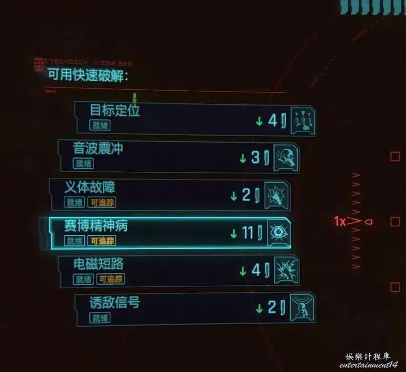 按照“音波震沖+義體故障×2+賽博精神病”,的順序上傳,首先音波震沖可以保證上傳時不會被對方駭客察覺,這也是2.0版本潛行黑客流的核心破解;義體故障可以在一定幅度上降低賽博精神病消耗的RAM點數。對了記得帶上目標定位,可以在掩體後面觀察鬥蛐蛐的戰況。