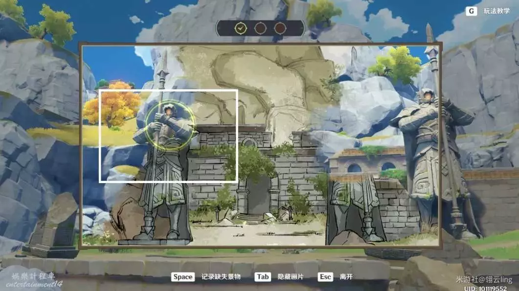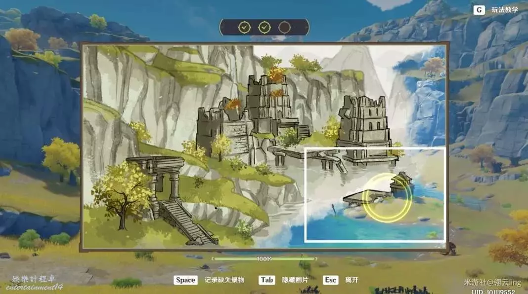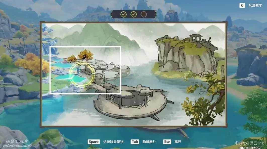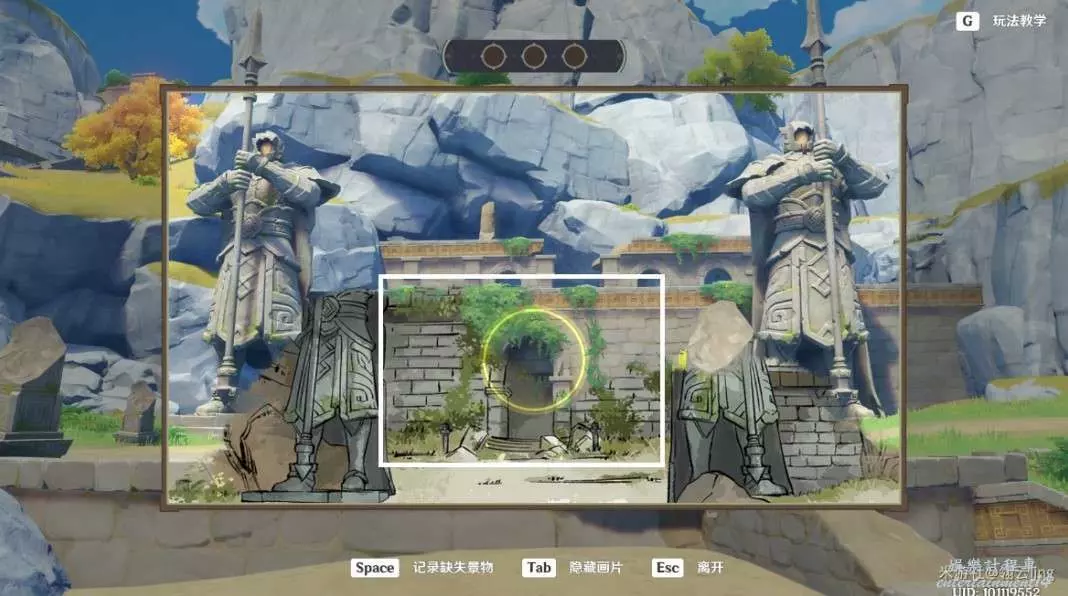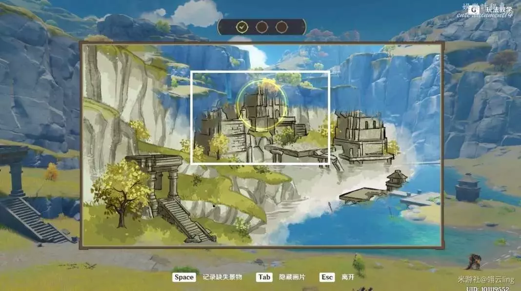 ③畫作左側與綠華池貼合,出現黃圈後,按空格記錄缺失景物。