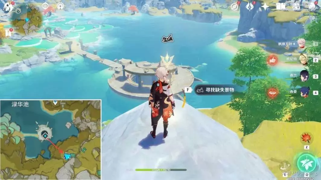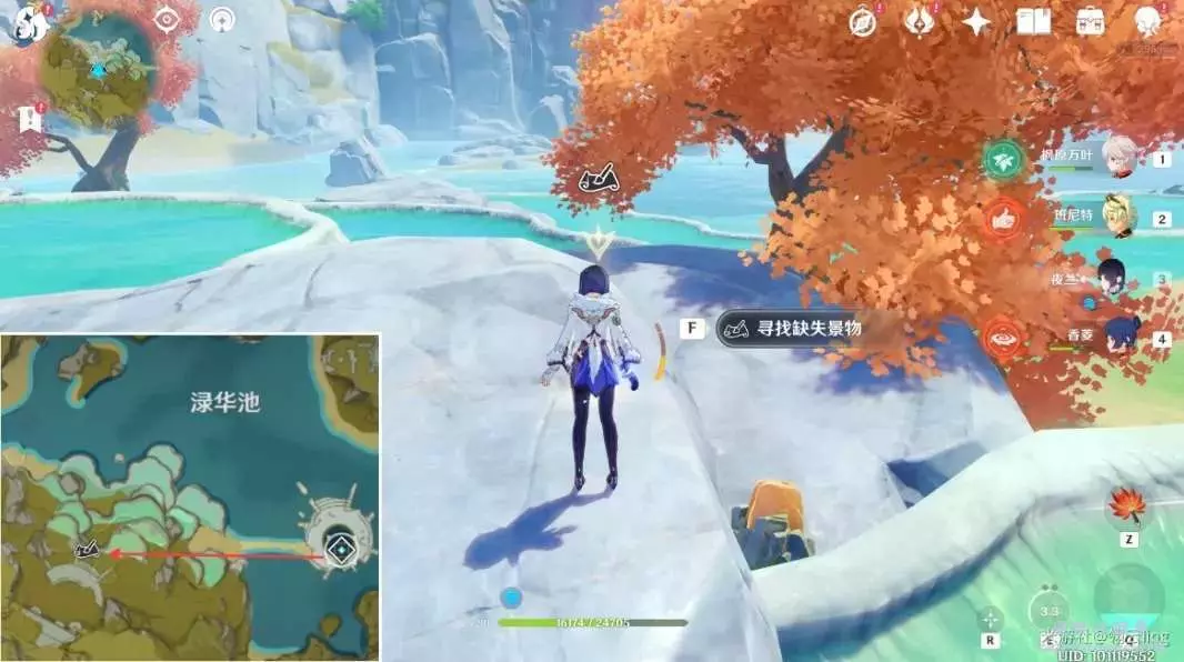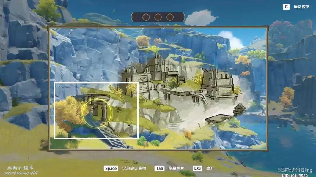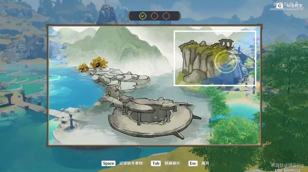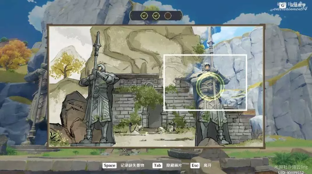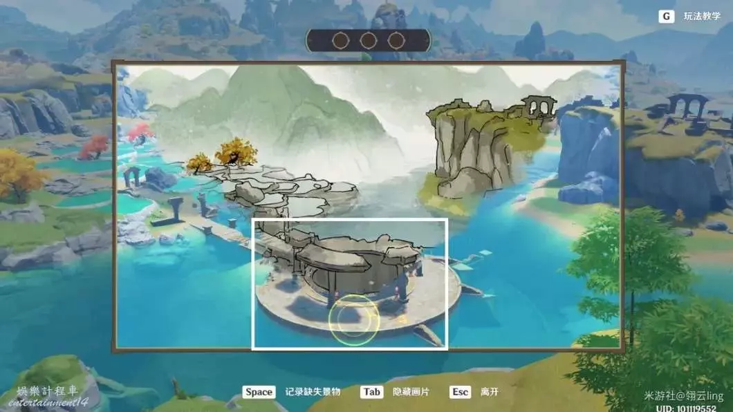 ③畫作左側與綠華池貼合,出現黃圈後,按空格記錄缺失景物。