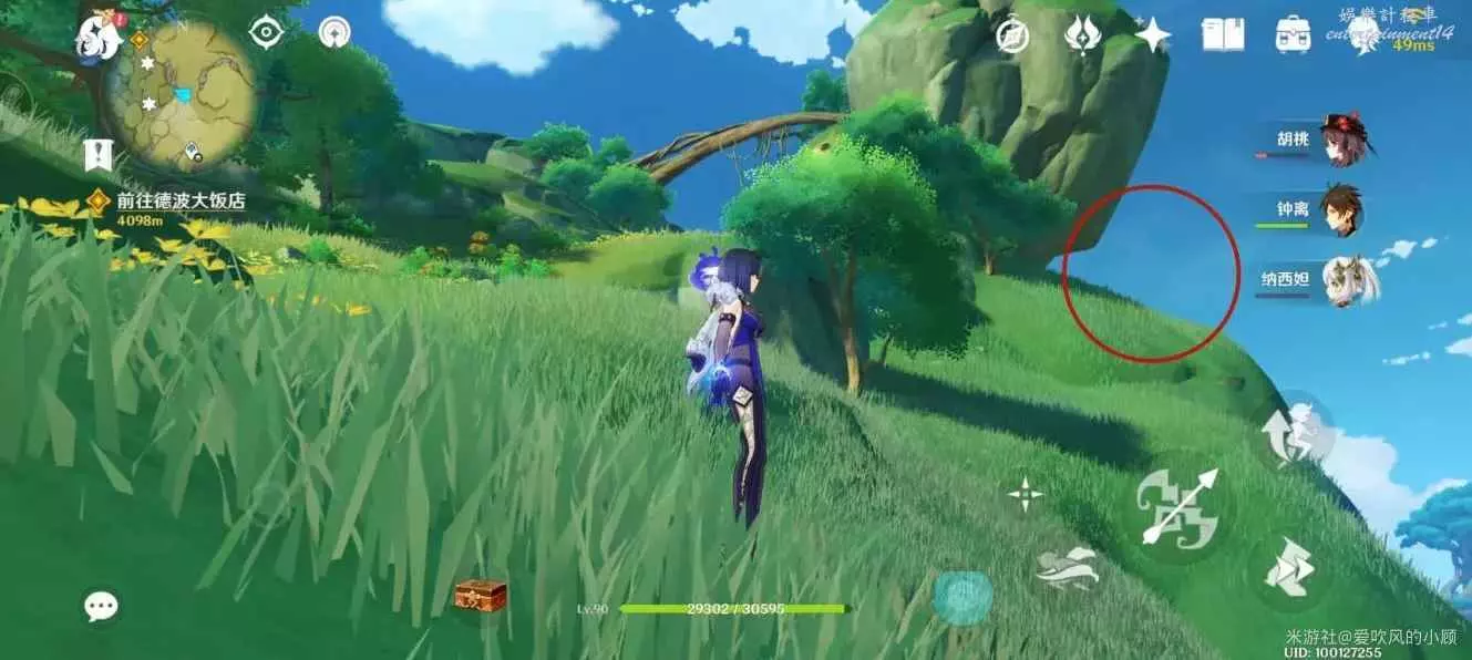 到地圖紅圈位置就是下圖該點位置,有解密,解密完成有一個華麗寶箱,利用草元素打擊,出現草種子飛到對面山頂去(華麗寶箱在對面山頂),並且採集最後一朵劫波蓮