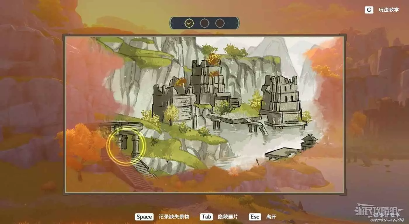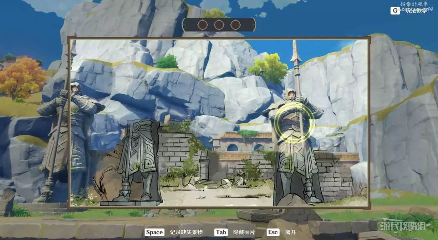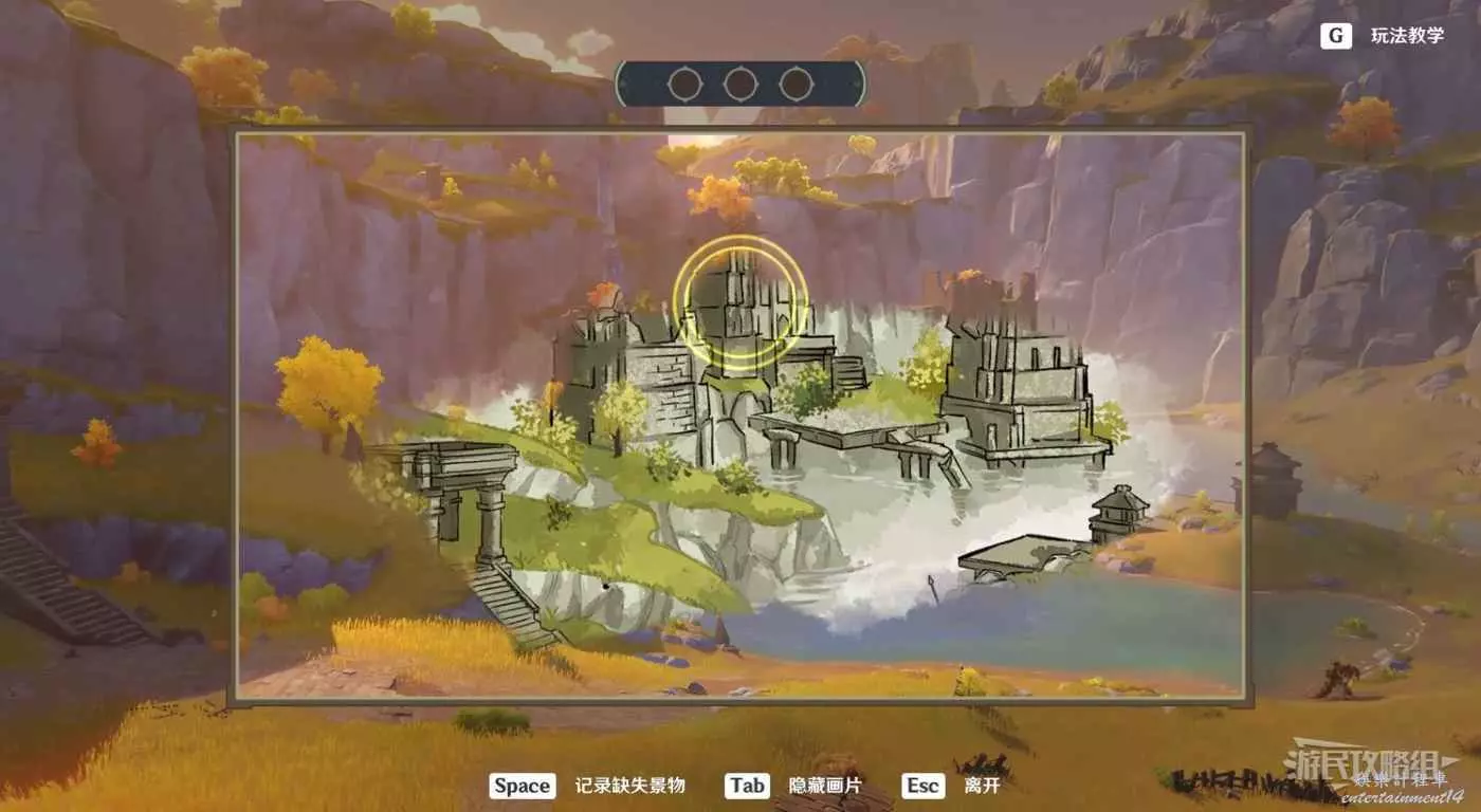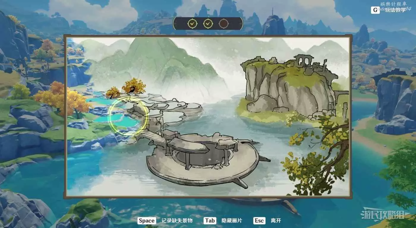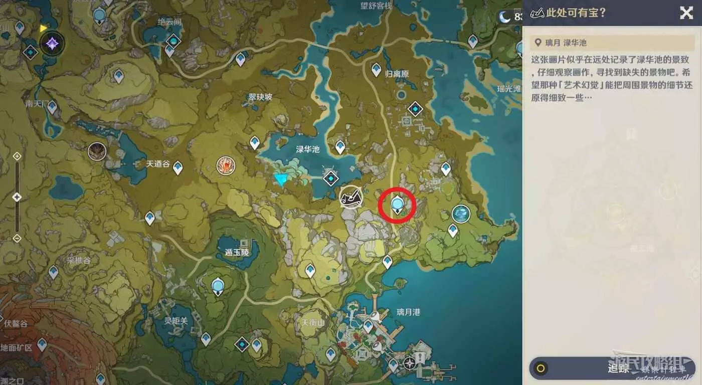 記錄缺失景物後,視角往左下方移動,對準螢幕中間下方的淥華池秘境的圓洞。