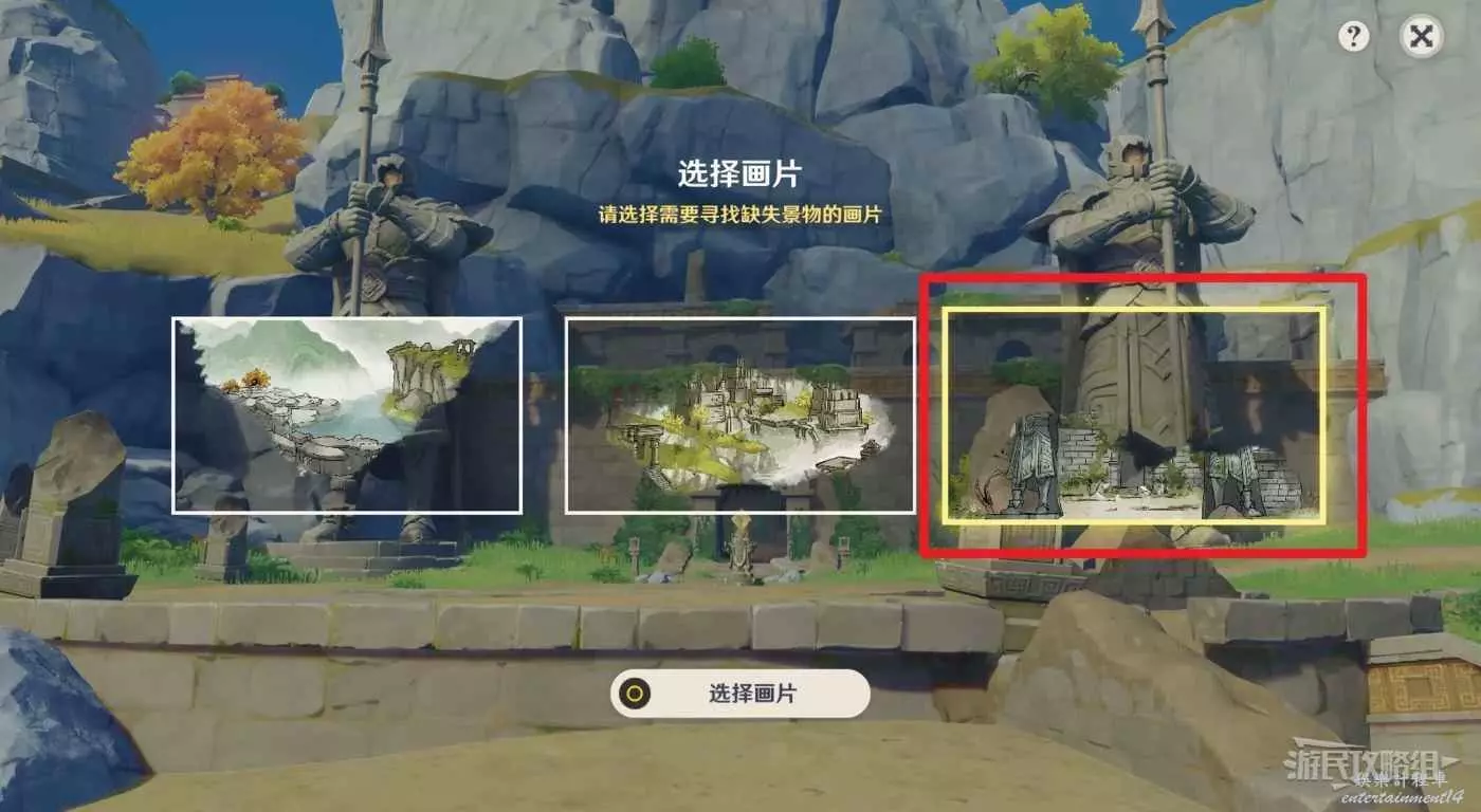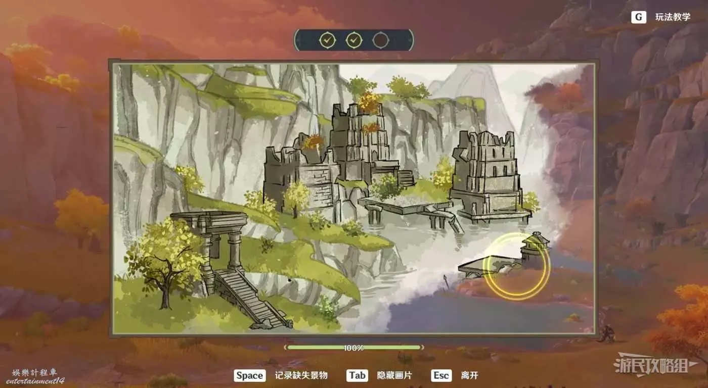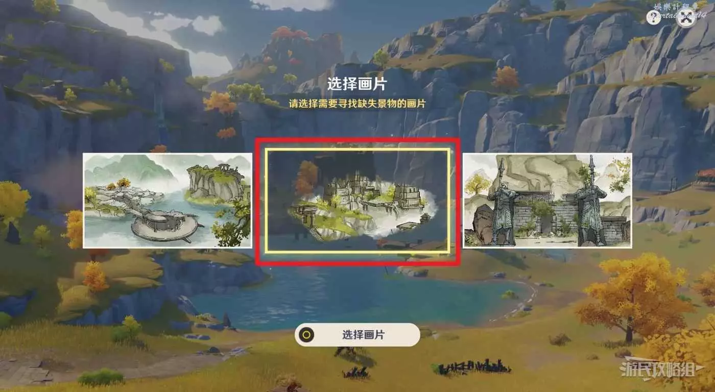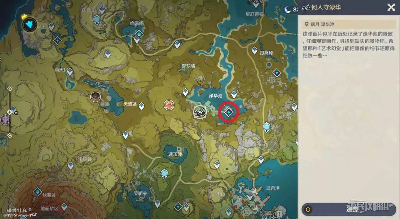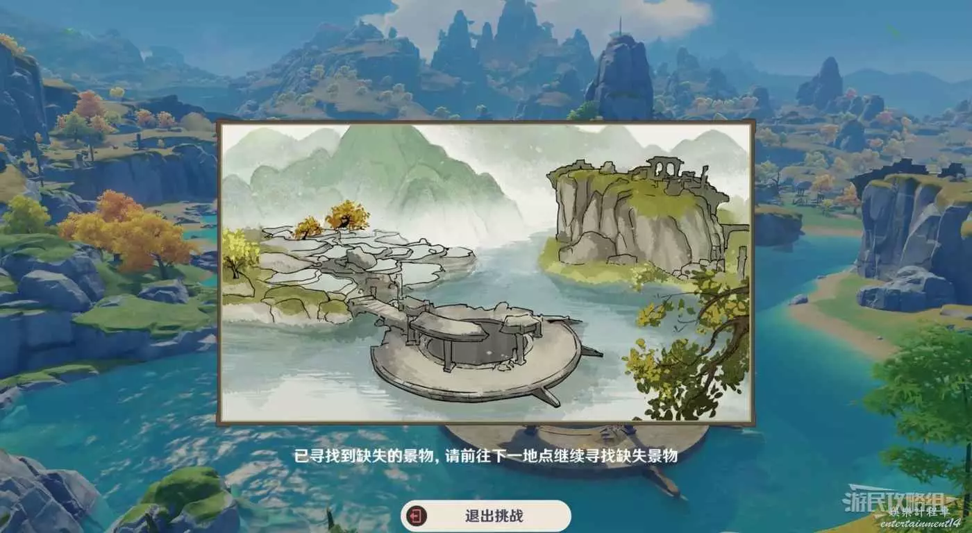 記錄缺失景物後,視角往左下方移動,對準螢幕中間下方的淥華池秘境的圓洞。