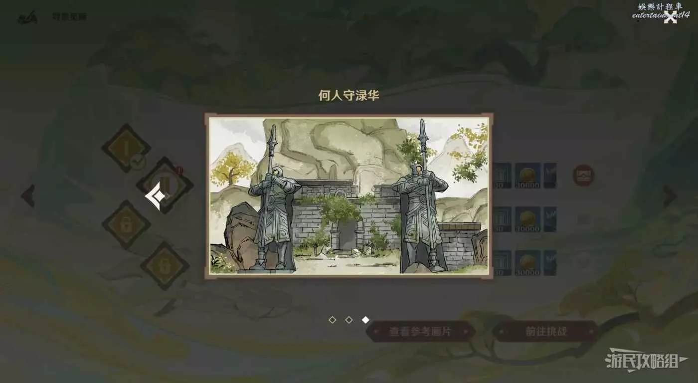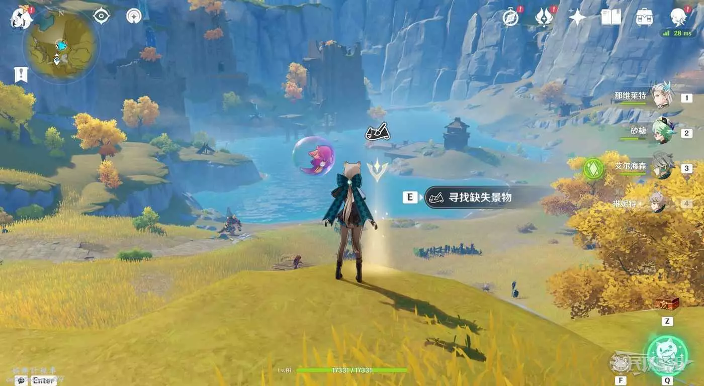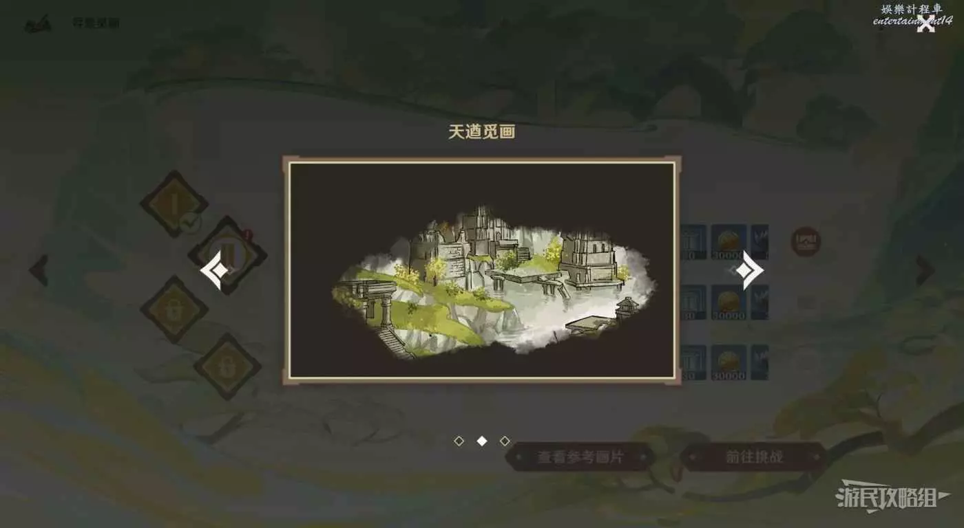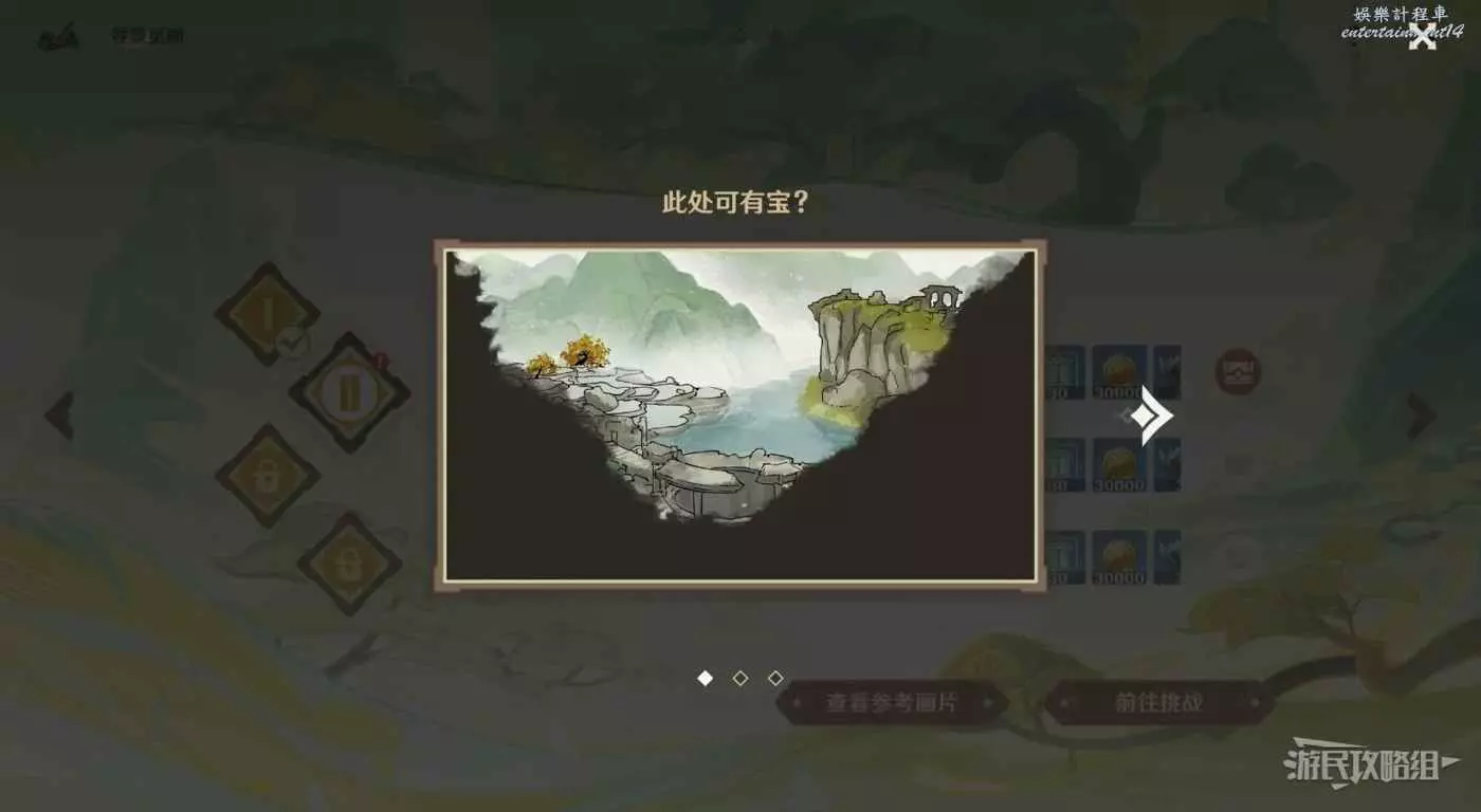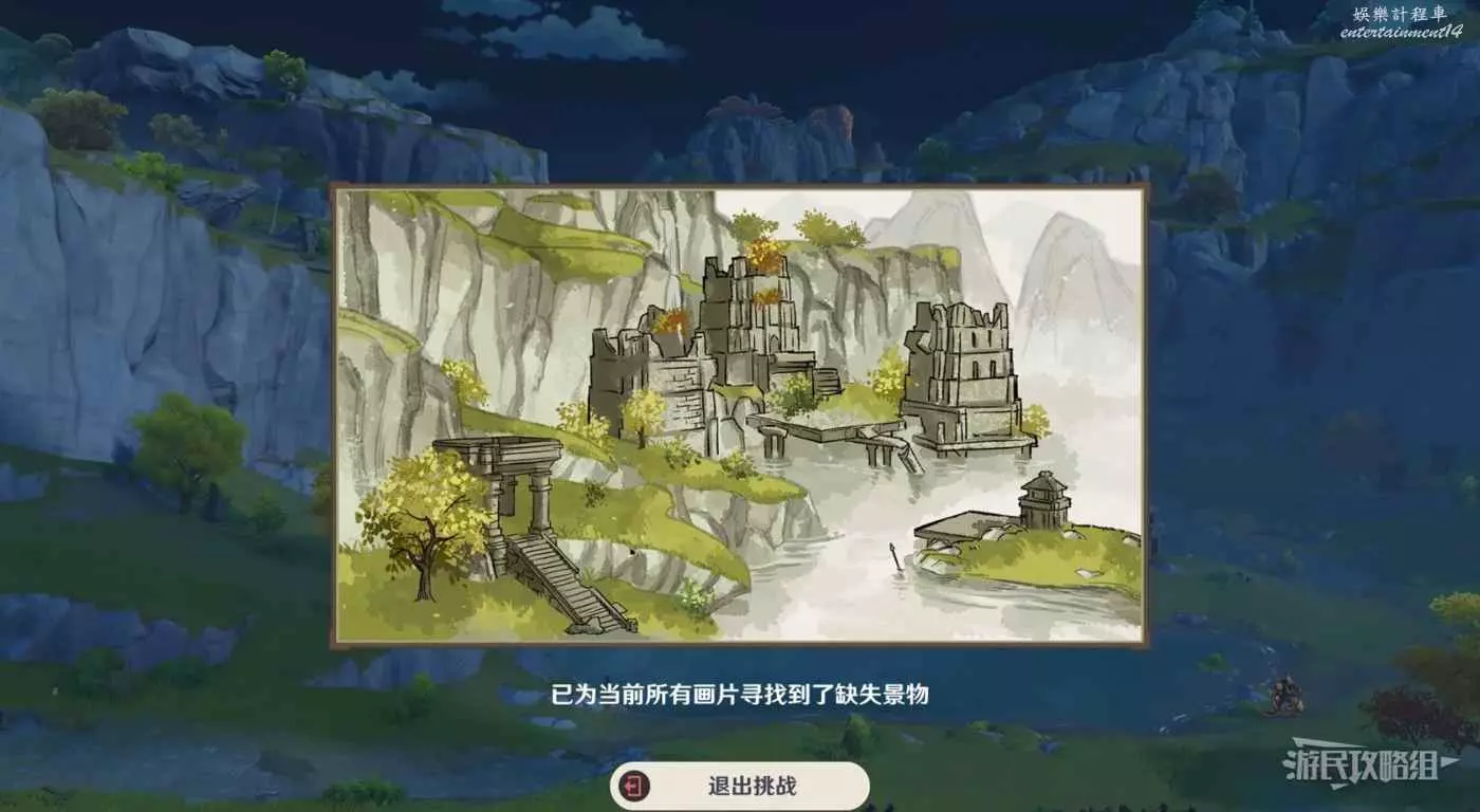 記錄缺失景物後,視角往左下方移動,對準螢幕中間下方的淥華池秘境的圓洞。