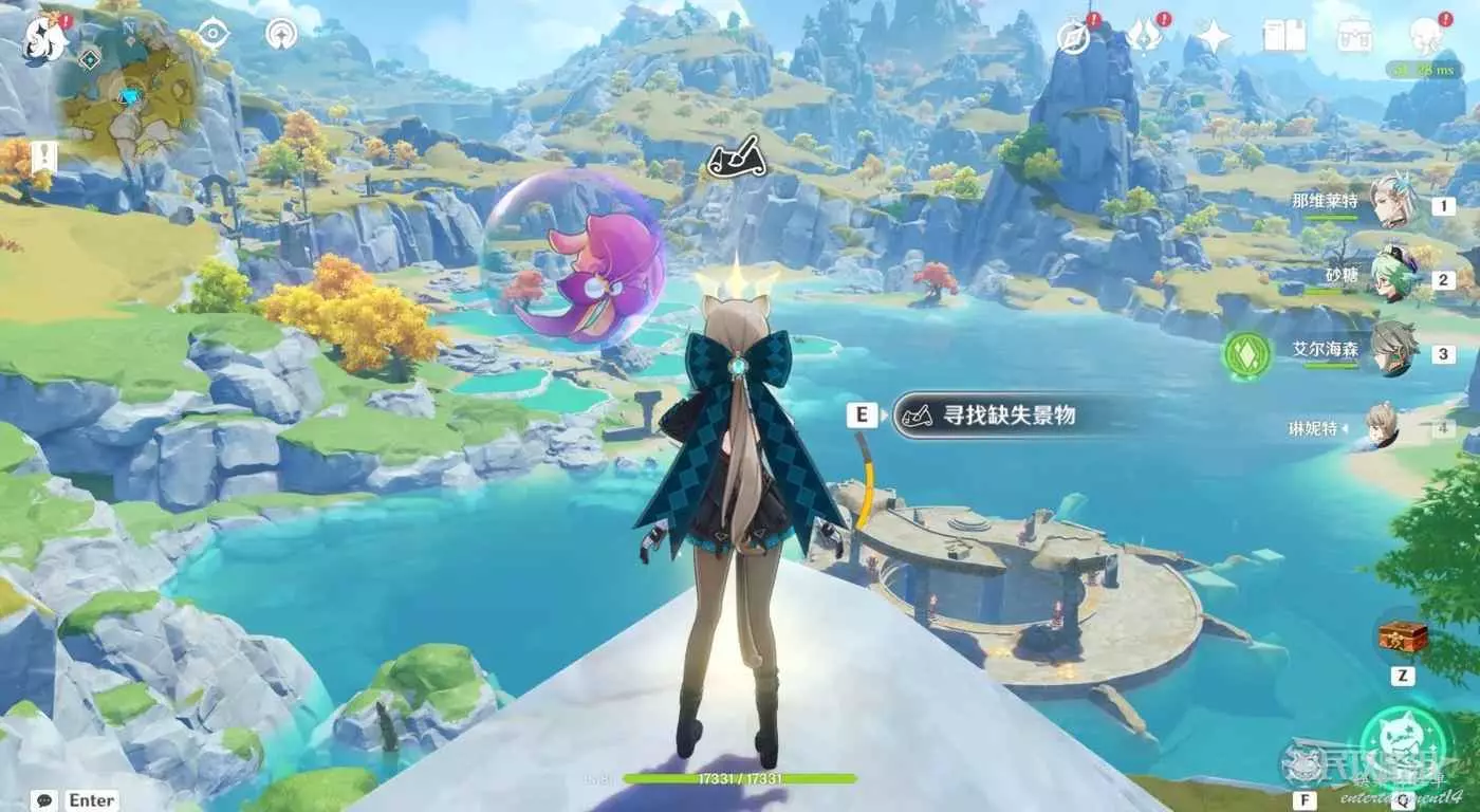 傳送到淥華池秘境,利用風場飛到地上,沿著水上平台往目標位置走。