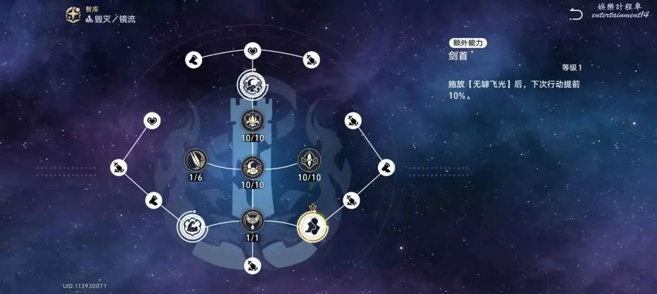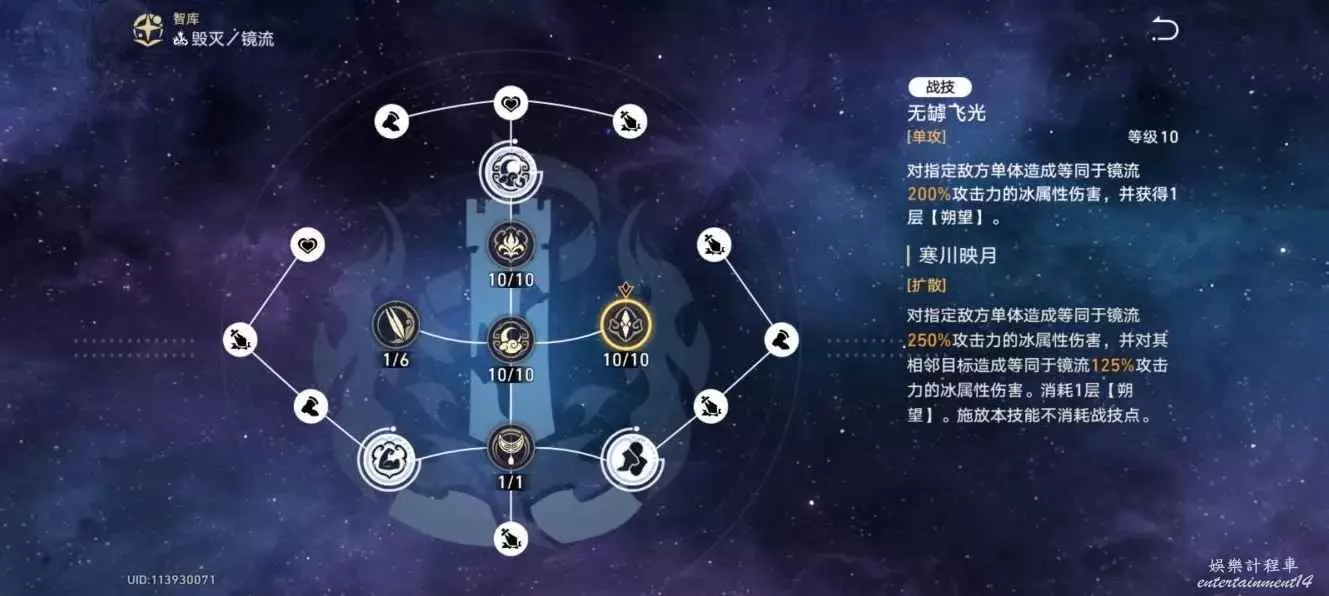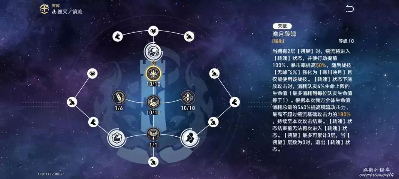鏡流擁有兩層【朔望】時進入【轉魄】狀態,使行動提前100%(不是額外回合,會消耗buff),並使暴擊率提升50%(10級天賦)