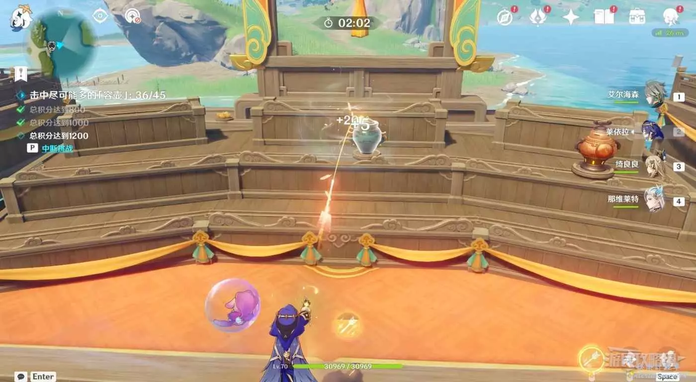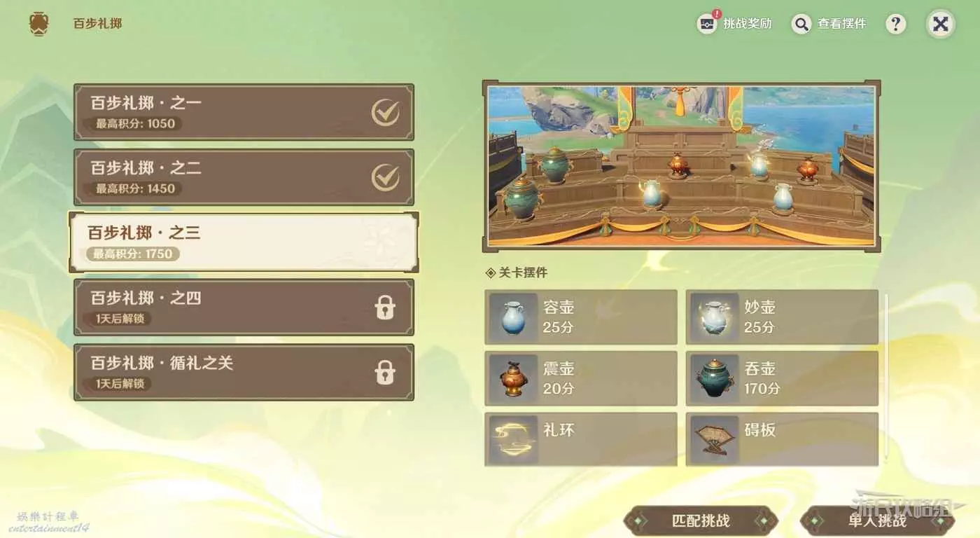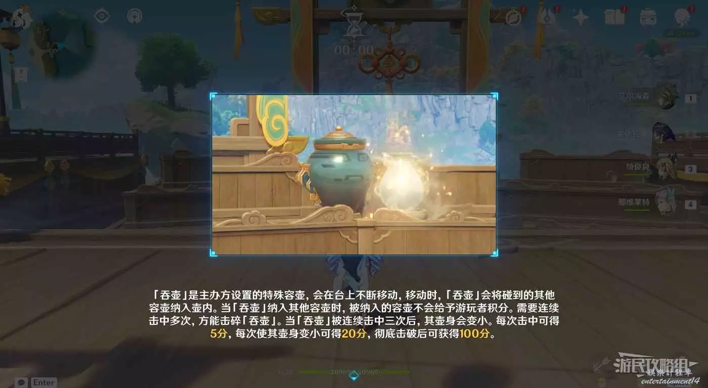 原神 (Genshin Impact) 4.1百步禮擲第三天滿獎勵攻略 16 10 月 2023-10-16 廣告 作者:瑞破受氣包 來源:遊民星空 挑戰獎勵 關卡擺件 關卡技巧 第三天新增了墨綠色的吞壺,會不斷移動並吞噬碰到的其他壺,需要多次命中才能將其擊碎。注意當吞壺出現時優先將其擊碎,可以利用妙壺的連續投擲將其快速擊碎。 也可以擊中吞壺附近的震壺,爆炸也會對吞壺造成傷害。但優先考慮使用妙壺的連續投擲快速將其擊碎。