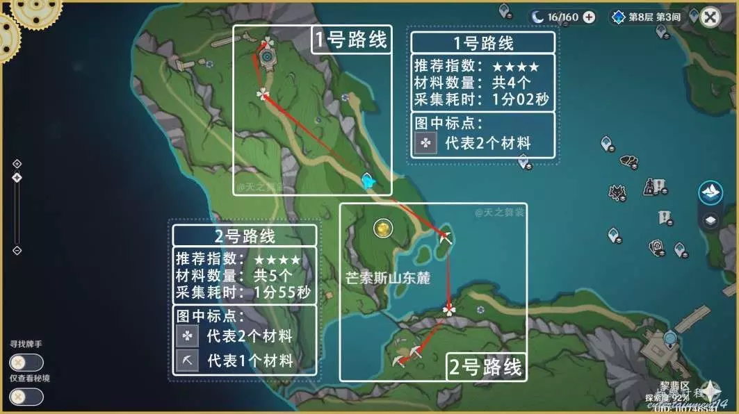 1、跑圖收集材料時建議帶上雙風,吃個藥。有夜蘭帶夜蘭,有散兵帶散兵,有綾華帶綾華。(早柚,莫娜,綺良良,琳妮特等跑圖角色都可以帶,可以節省很多跑圖時間)