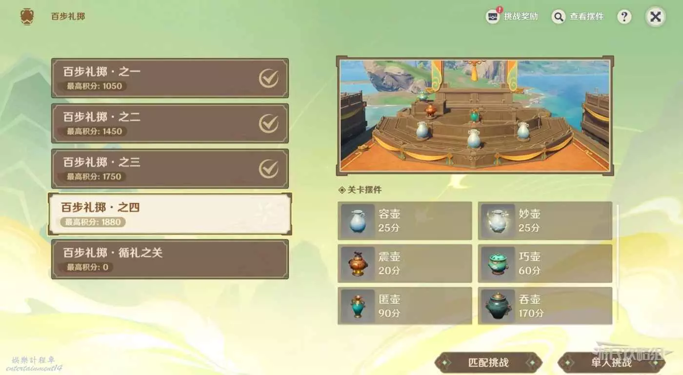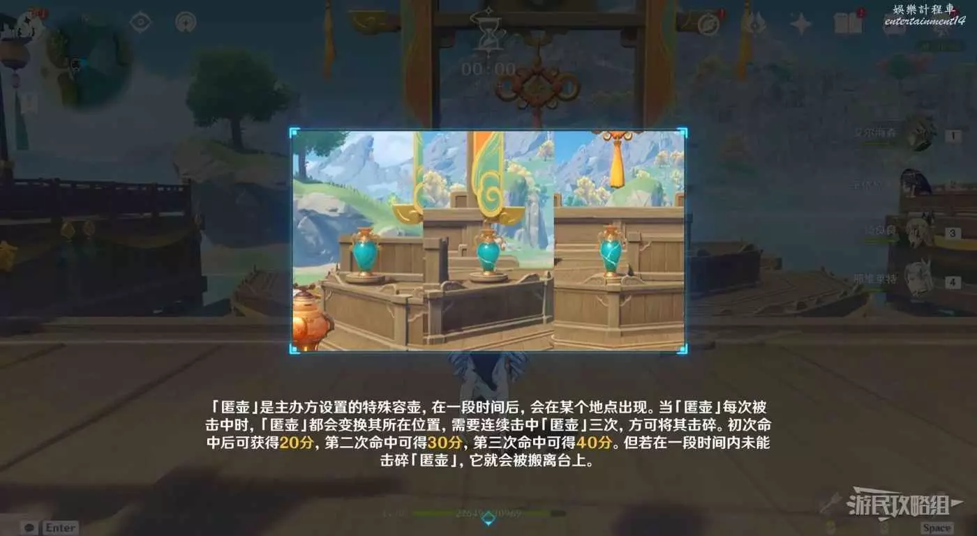第四關新增了藍色的匿壺,在每次擊中後都會更換位置,需要連續擊中三次才能將其擊碎,如果擊中一次後,在其他時間內沒有將其擊碎它就會自己消失,無法獲得該壺能獲得的分數。建議看到後優先將其擊碎,或者先完全清理其他壺最後再處理匿壺。