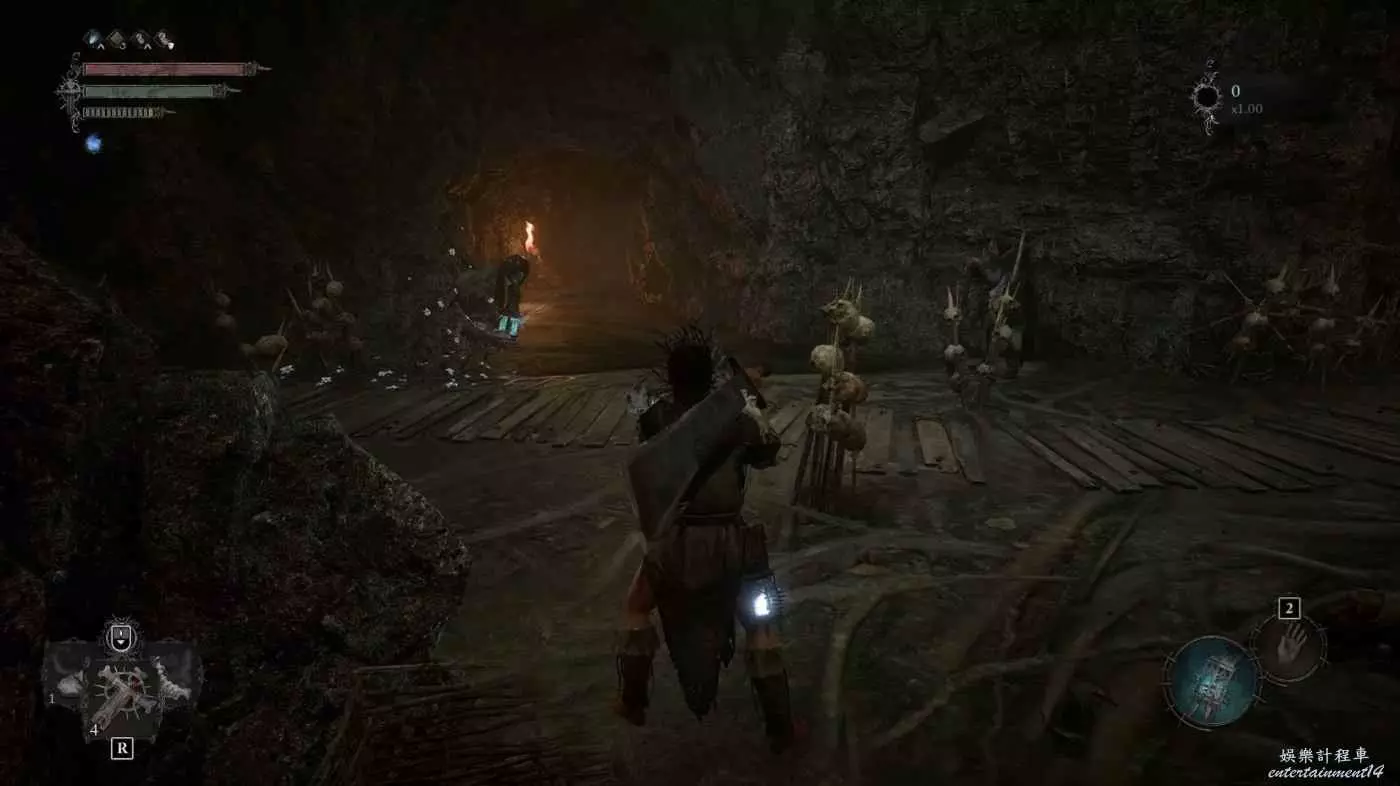 打死這幾個弓箭手以後,上面岔路左邊有個小錘哥,小錘哥旁邊有一個可以進入陽間的東西,小錘哥這條路再往前一點是一個可以自己拉篝火的地點。