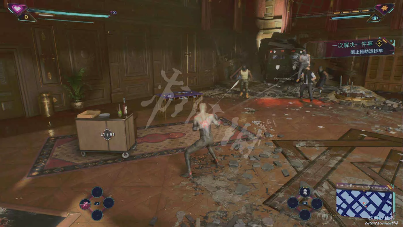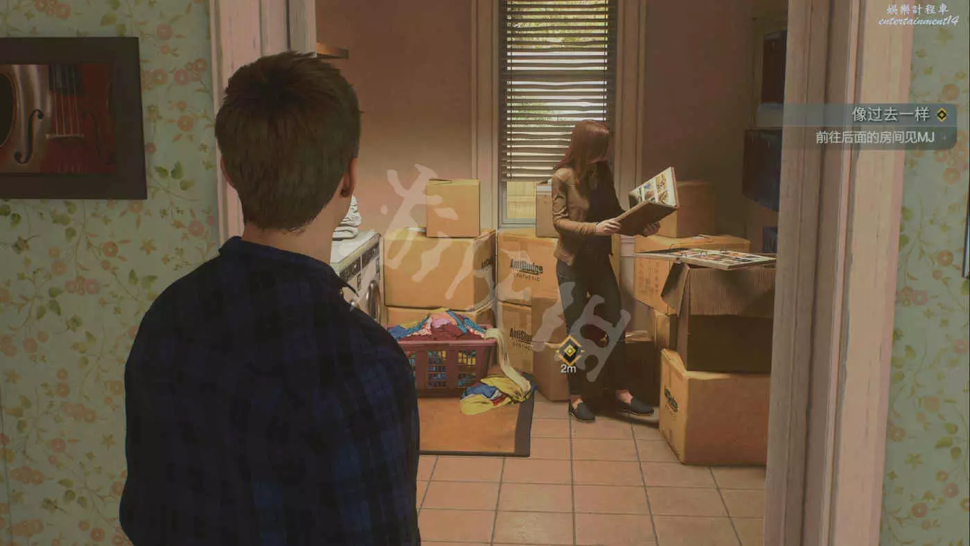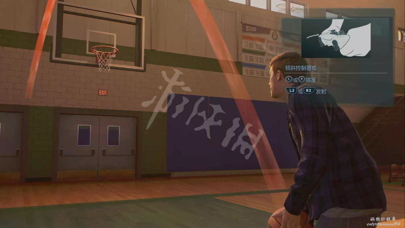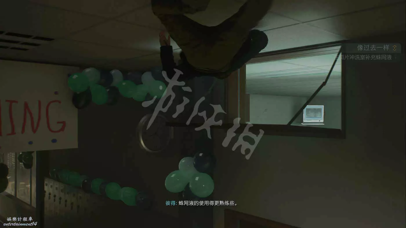 投籃結束回到過去,跟隨路標取回U盤,電梯口用蛛網發射器打破氣球引起保安注意。