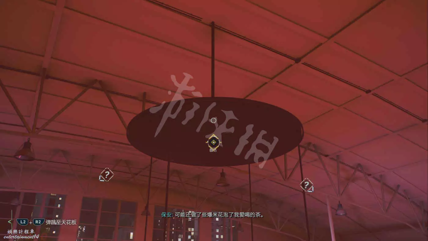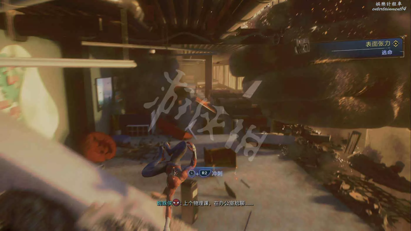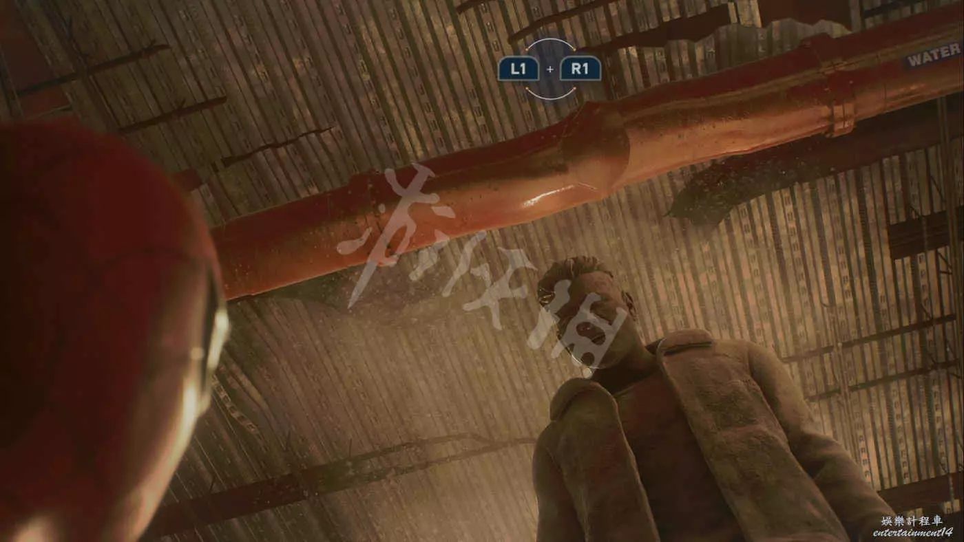 拽倒垃圾桶後迅速跳上天花板,躲過清潔工與哈利匯合。