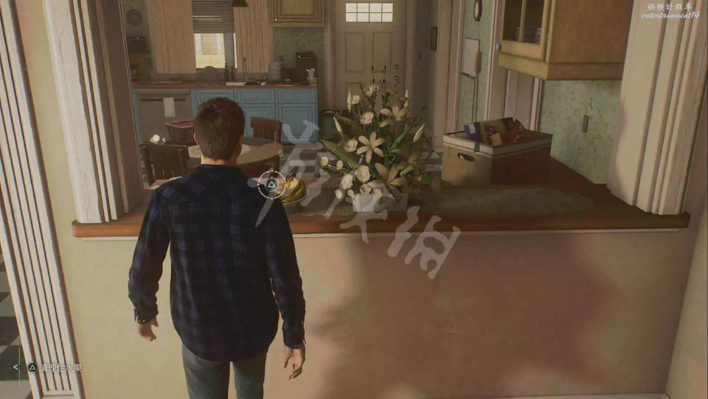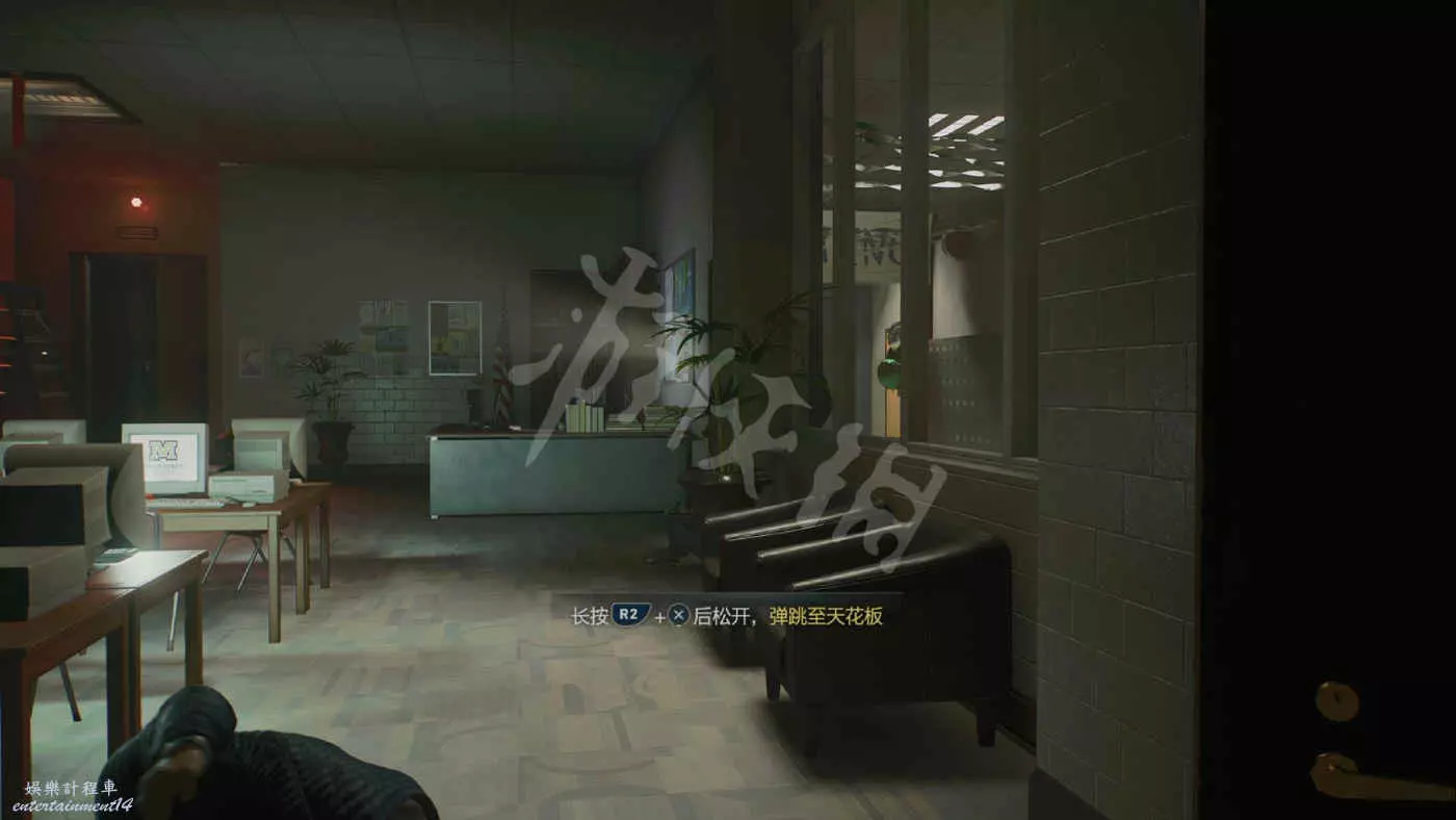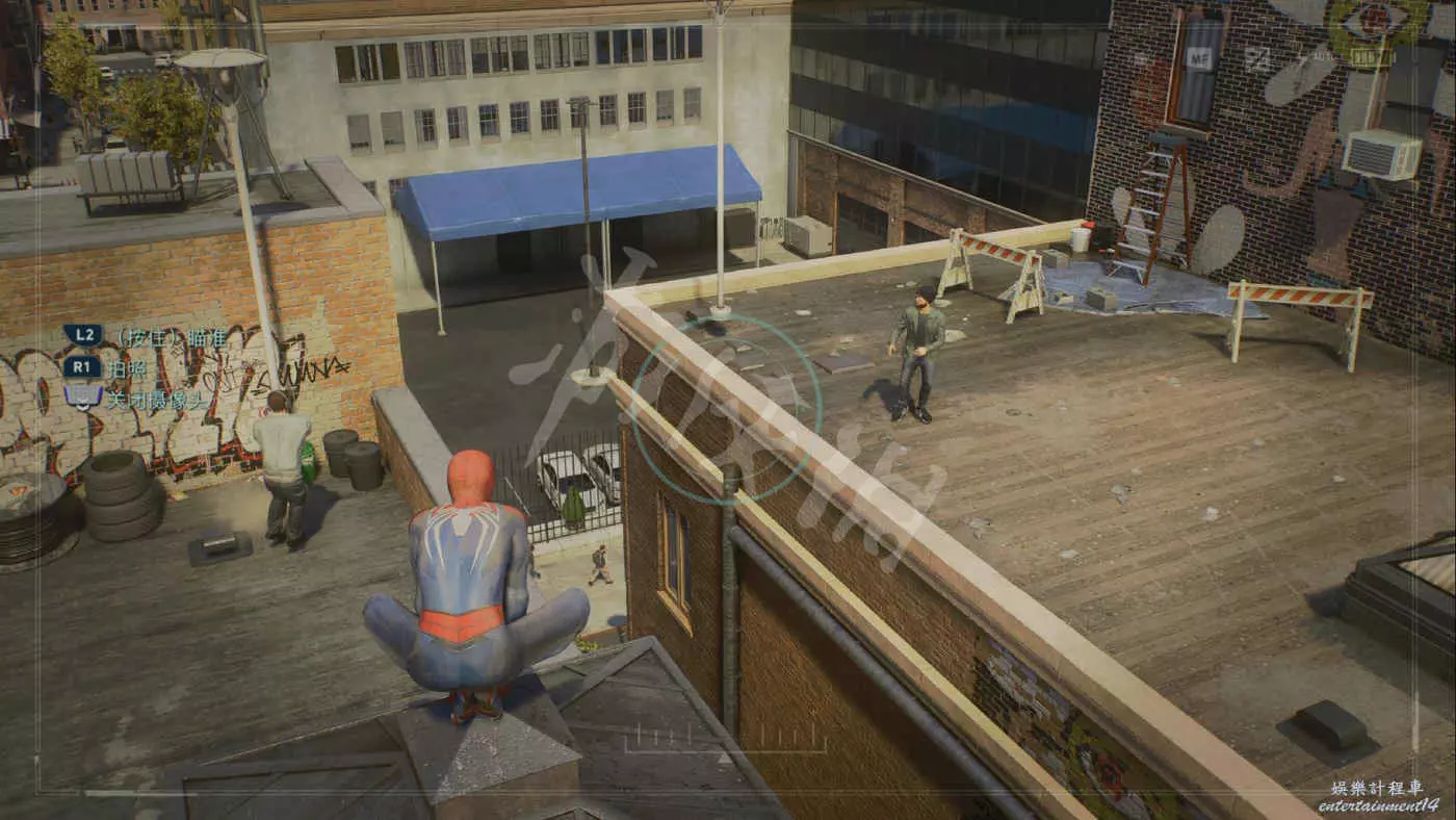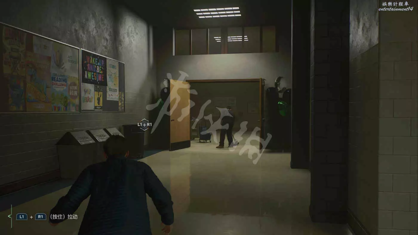 拽倒垃圾桶後迅速跳上天花板,躲過清潔工與哈利匯合。