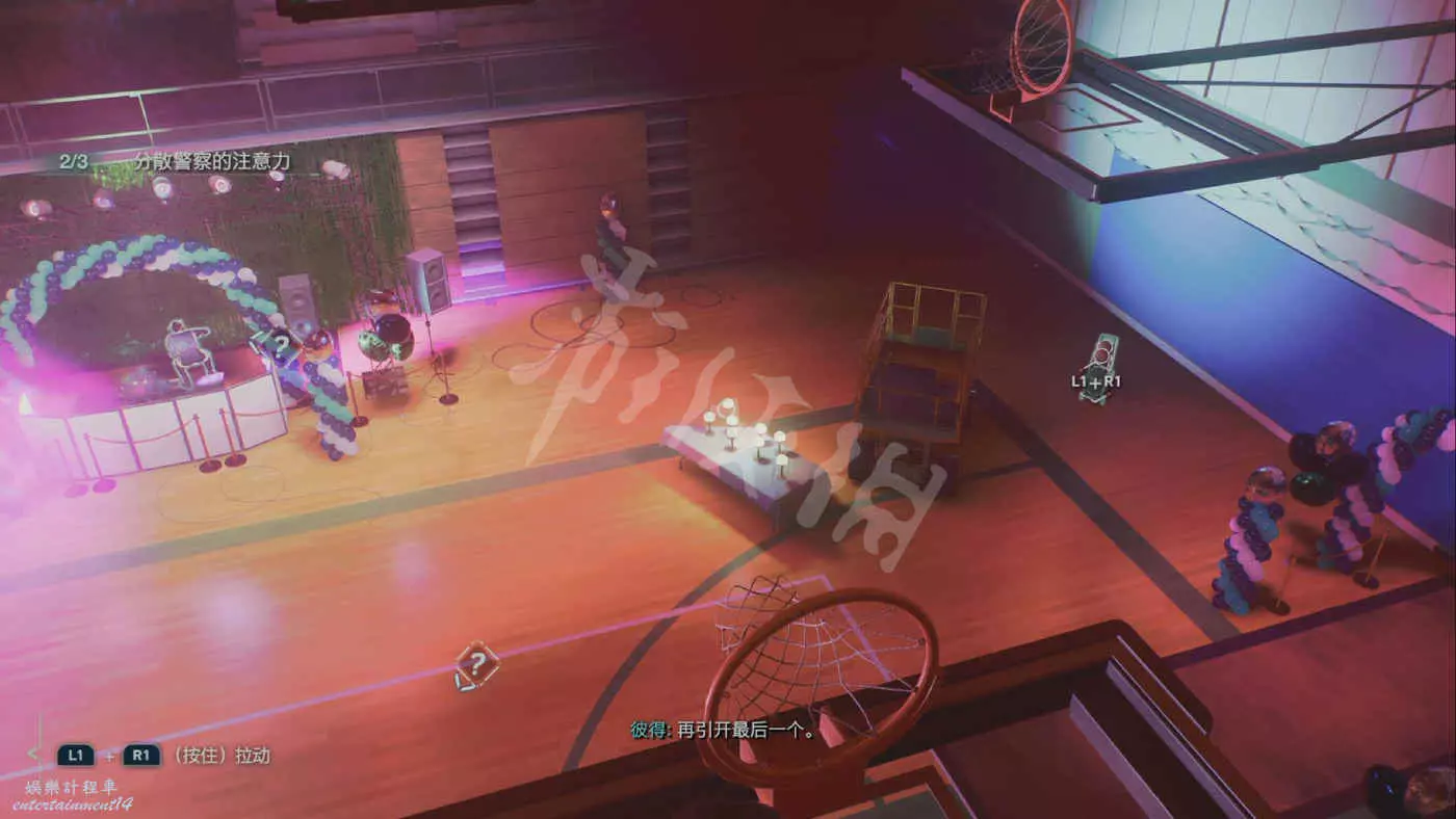 警方到來,用蛛網啟動設施分散注意力,首先是DJ台,接著是相機,最後拉動籃球收納車。