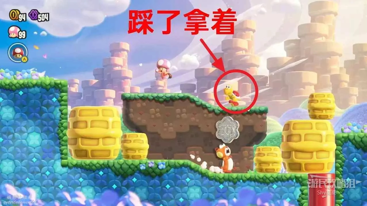 在本關前進的路上,不要拾取大象形態,遇到紅色烏龜後,將其踩入殼中,用手拿住。
