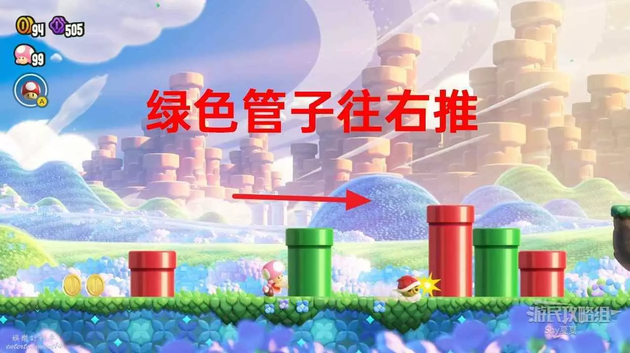 此時踩死左邊的敵人,向右推動綠色管子,使龜殼只在一格內移動。