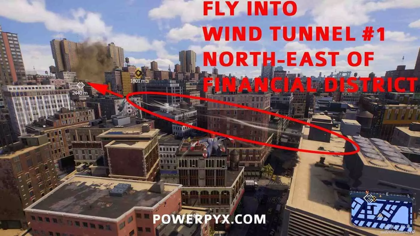 在空中按△鍵使用蛛網翼,風洞在靠近時會變成綠環,飛過綠環獲得加速狀態,一個接一個通過風洞,直到達到阿斯托里亞。最方便使用的風洞位置在金融區東北部和河的上空。