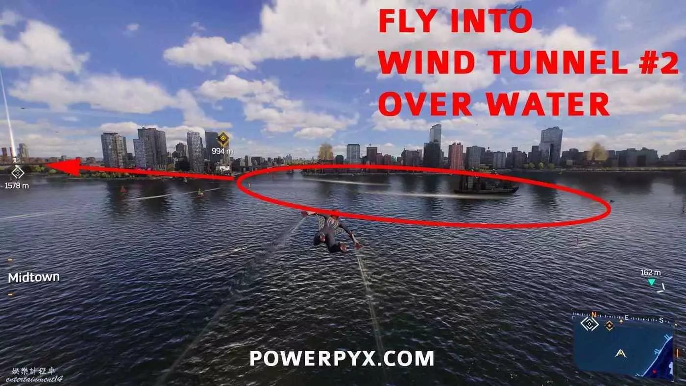 需要完成主線任務3讓我看看紐約以解鎖風洞,使用蛛網翼飛入風洞時速度會提升,這樣能使飛行的距離足夠遠。然後需要從地圖西南角的金融區一直滑翔到地圖東北角的阿斯托里亞,只能使用蛛網翼和風洞,不能使用其他能力(包括不能使用R2蛛網翼也不能用×加速等)。