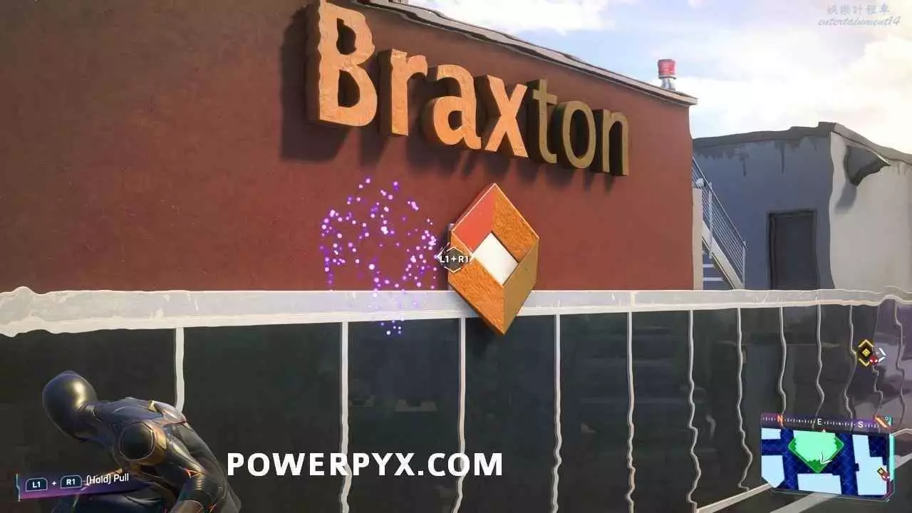 掃描建築南邊次頂層的Braxton標誌牌,然後按L2+R2到達牆上的美國國旗上,再按L1+R1把Braxton標誌牌下方的LOGO拉開露出一個通風口。按L2+R2穿過通風口並避開鐳射,最終即可拿到獎勵。