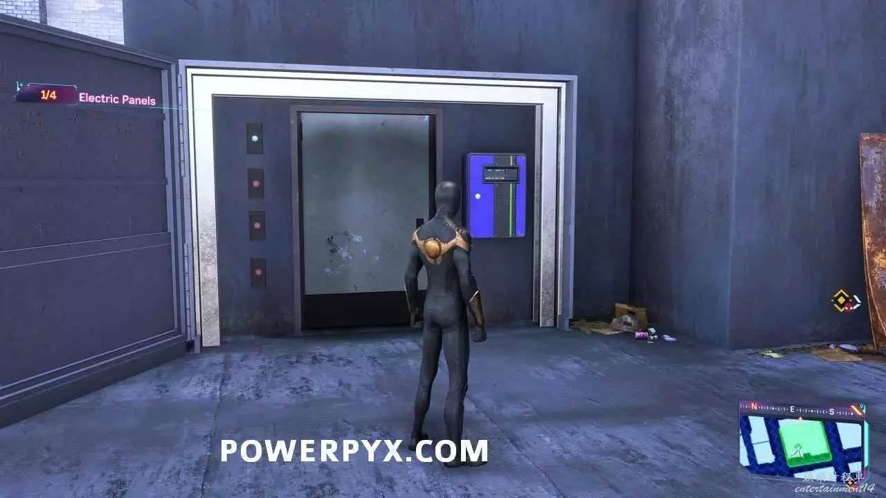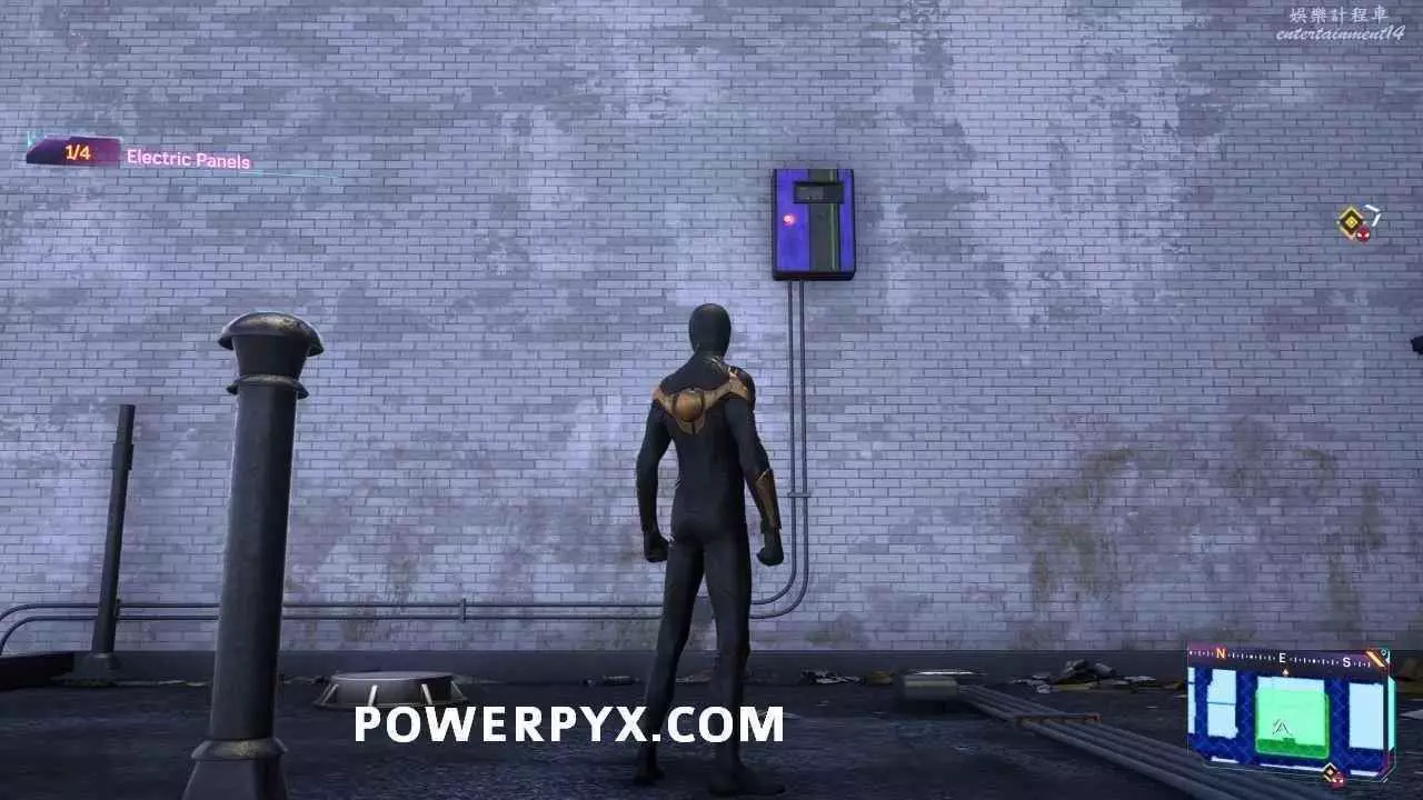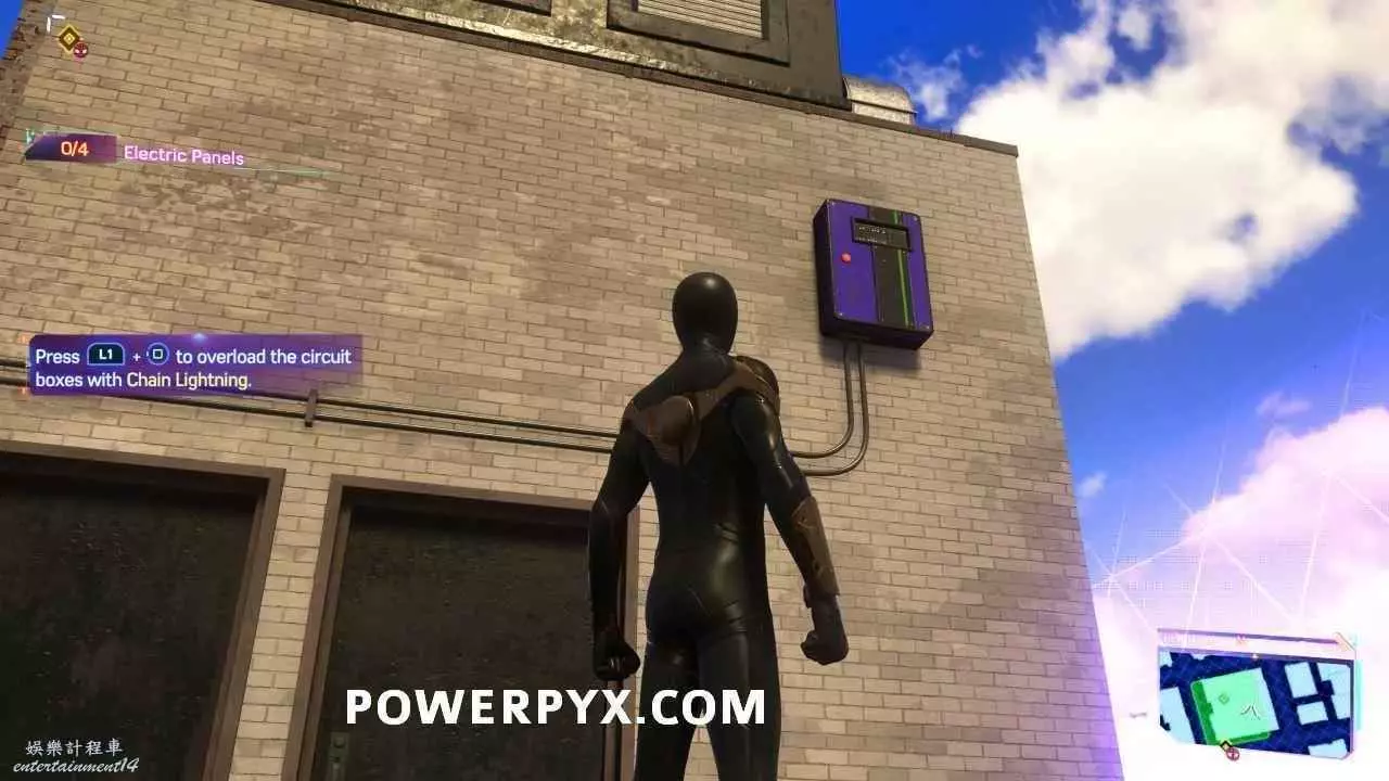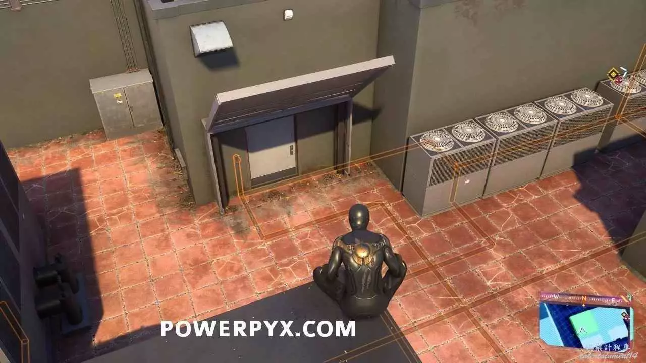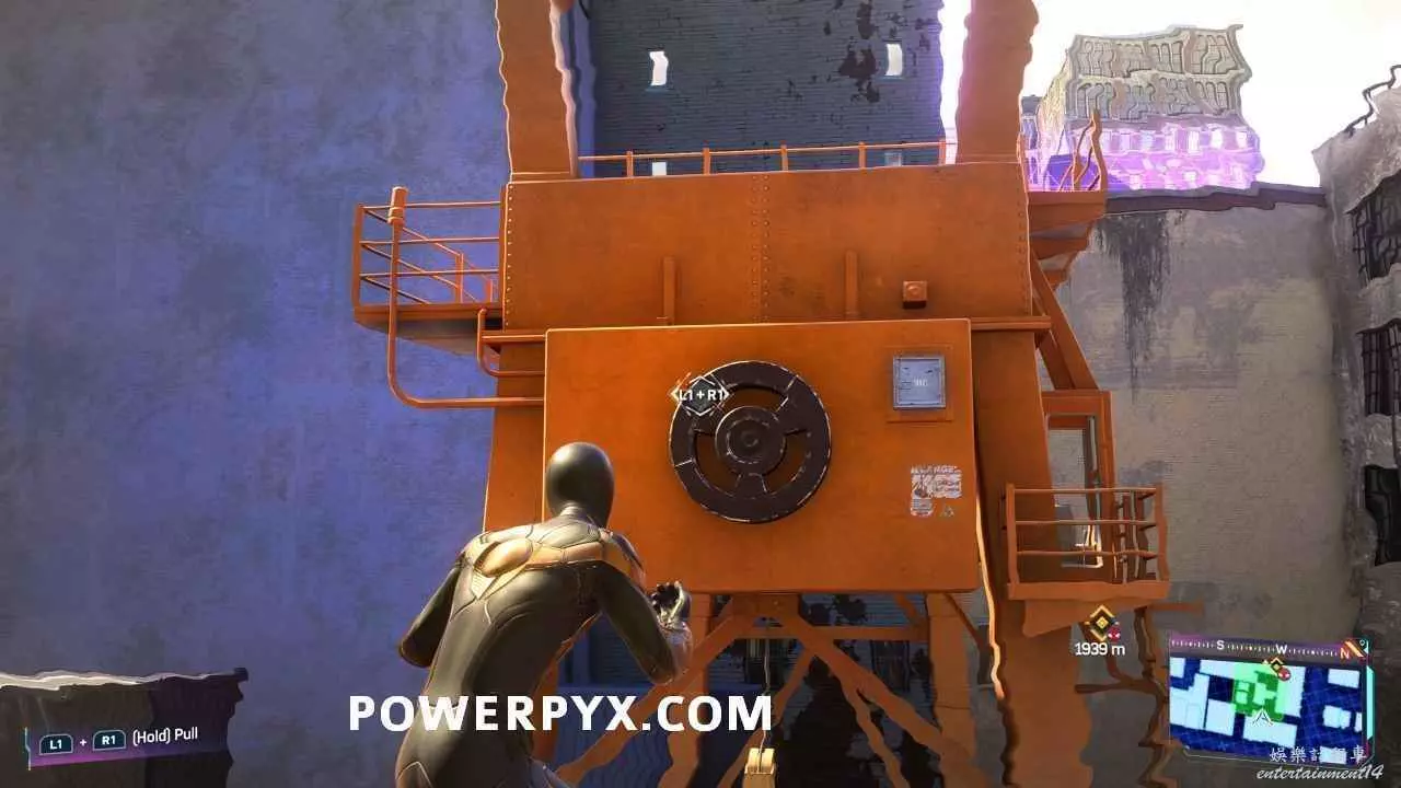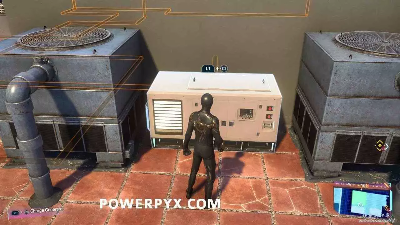 按L1+□鍵啟動發電機,然後按R3掃描,沿著橙色電纜找到下一處發電機並啟動它。之後繼續跟隨電纜,在漏電的部分按L2+R1射出蛛網以修理電纜。繼續沿著電纜走,可以看到屋頂上的門打開了,裝備箱就在門後。