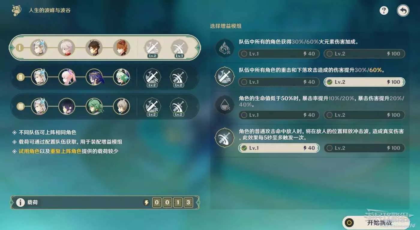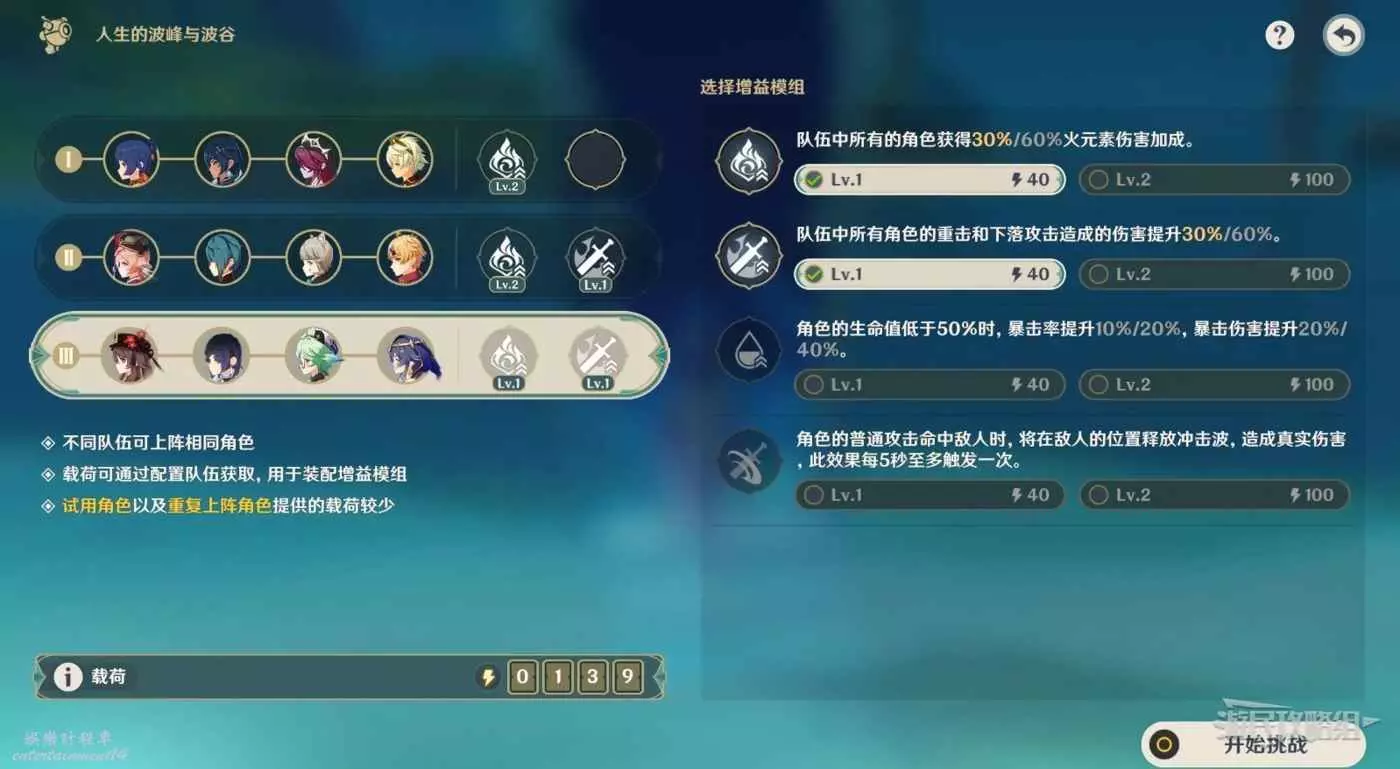注意載荷不會影響最終的得分,只是用來兌換增益模組的,上陣的不同角色越多,載荷越大,就能選擇消耗載荷更多的增益模組,不會影響最終得分。但載荷量與角色等級有關,例如上陣90級的香菱和50級的香菱,所獲得的的載荷量是不一樣的。