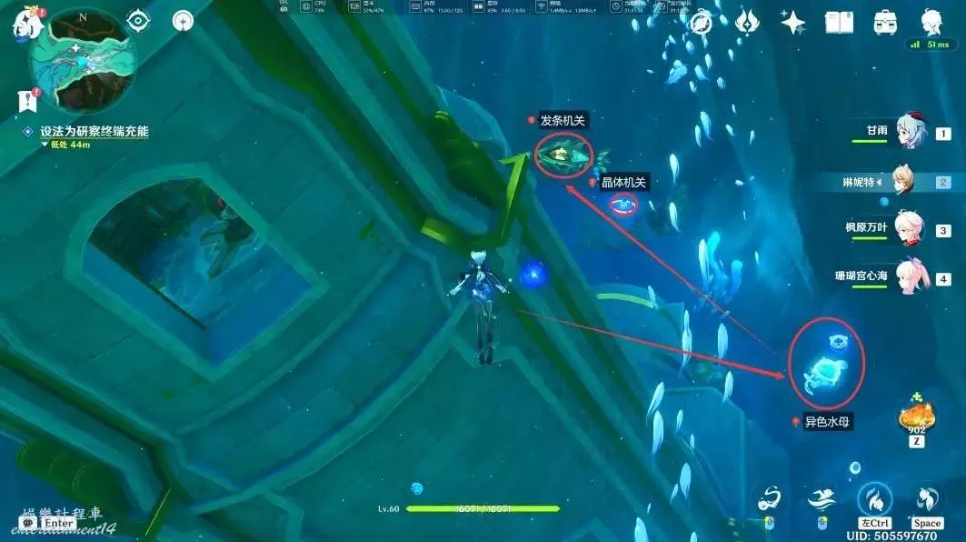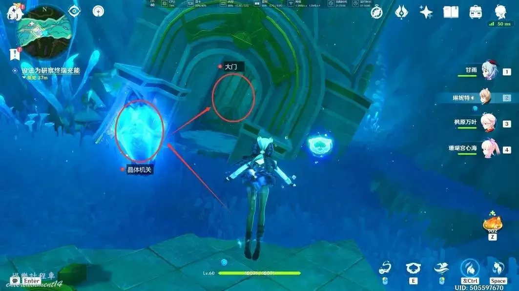 (由於大門是短暫開啟,所以我們需要用到異色水母的能力,丟出隆隆帽子炸彈在晶體機關旁,之後遊到大門前引爆隆隆帽子炸彈,即可開啟大門進入其中)