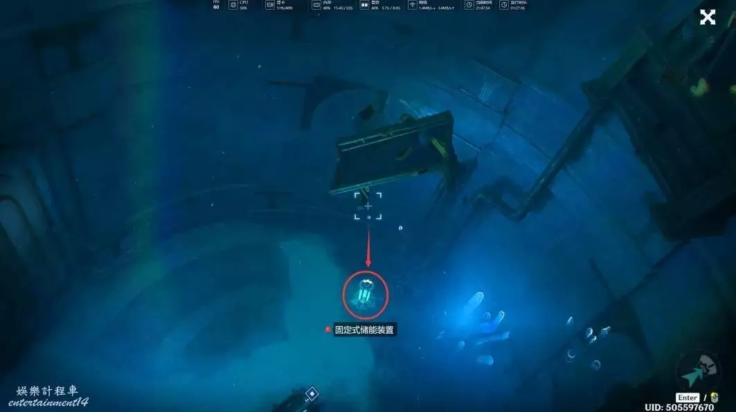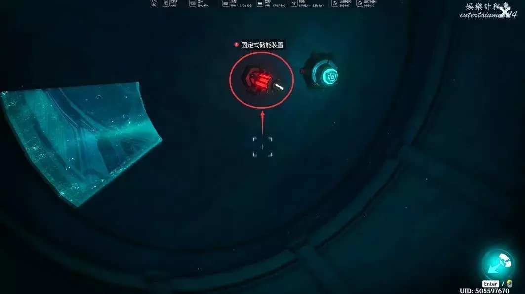第三次切換完視角後,我們視角往下移,對準下方的「固定式儲能裝置」,左鍵吸取其中的能量