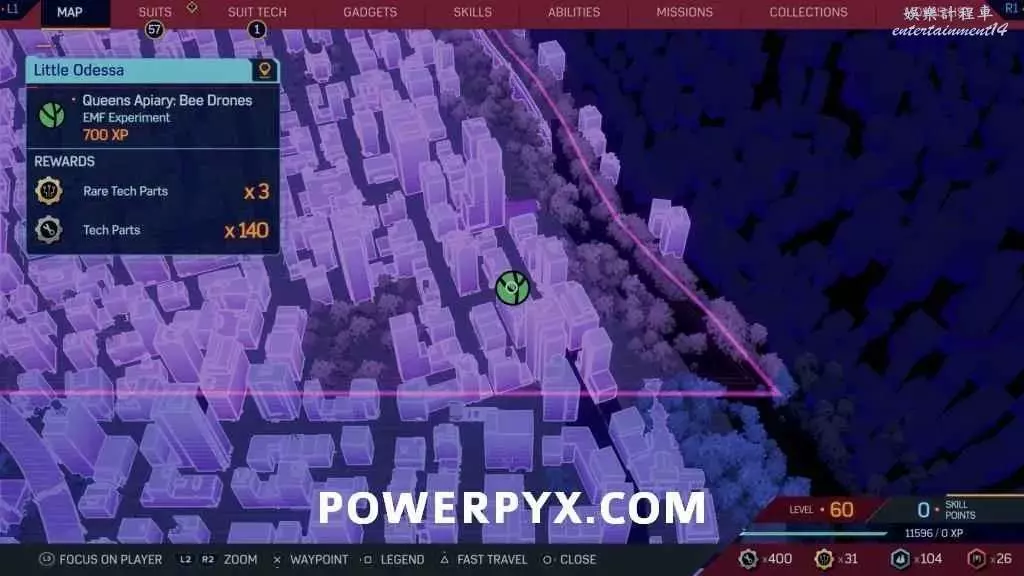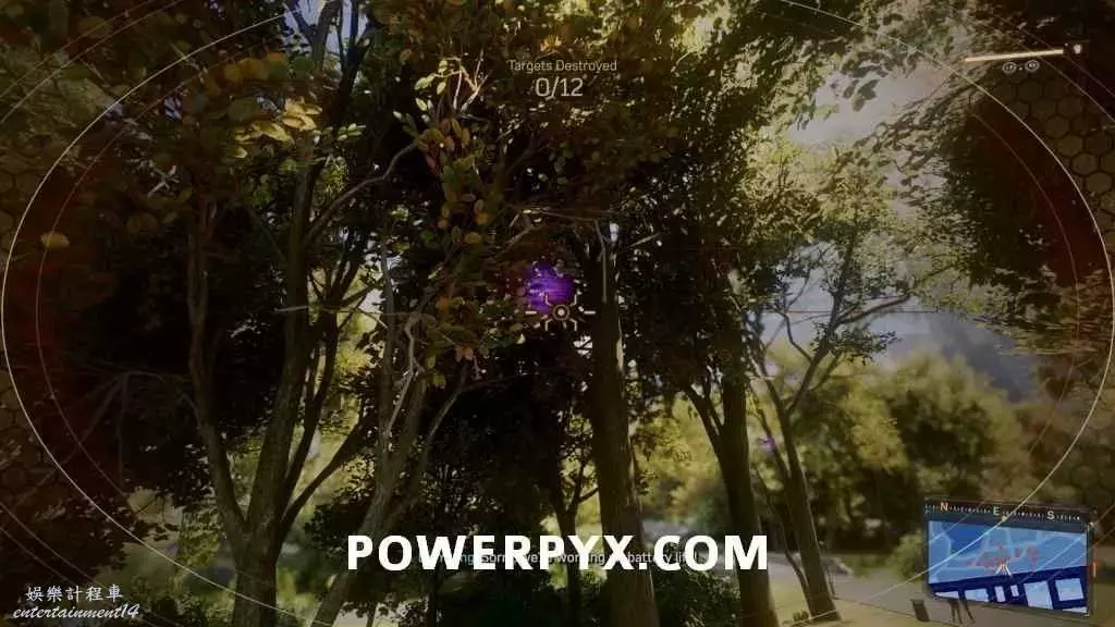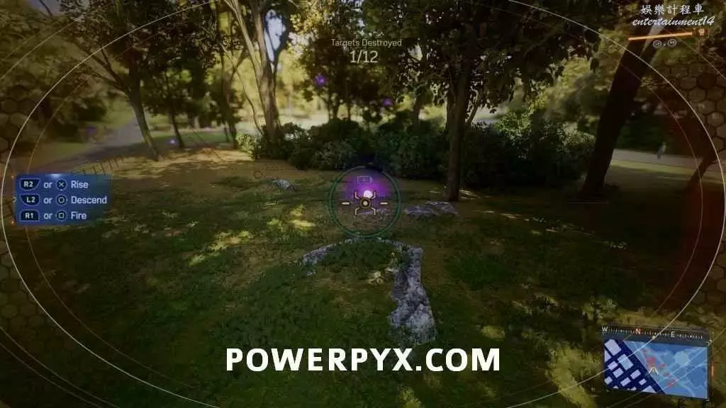 此實驗與之前同類實驗玩法相同,射擊特定數量的紫色目標。然後前往5個標記位置,期間無人機會被偷走,需要先找到無人機。到達公園後附近有4座建築,我們需要掐我那個第三個的屋頂(從地圖的北邊往南數),無人機就在天線上,按住△鍵連接到無人機。
