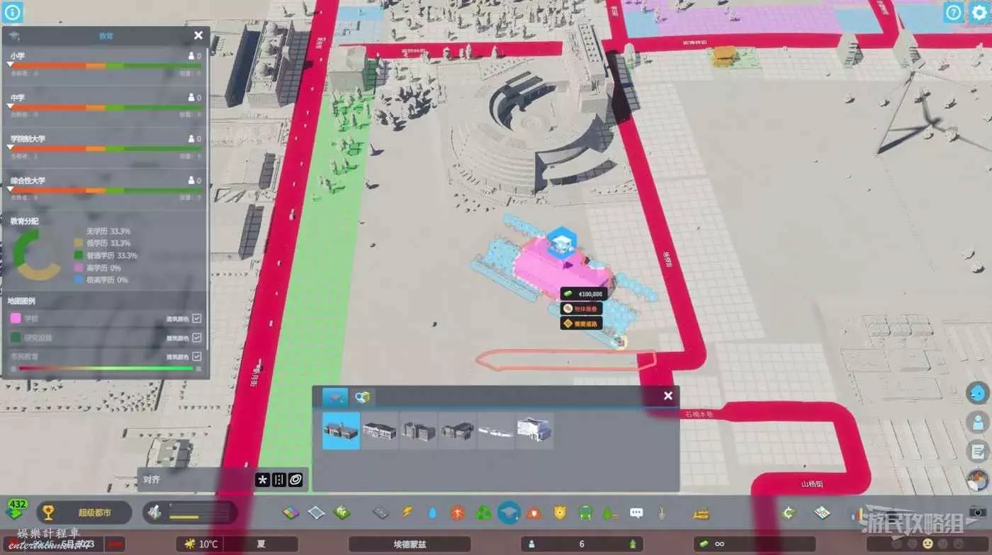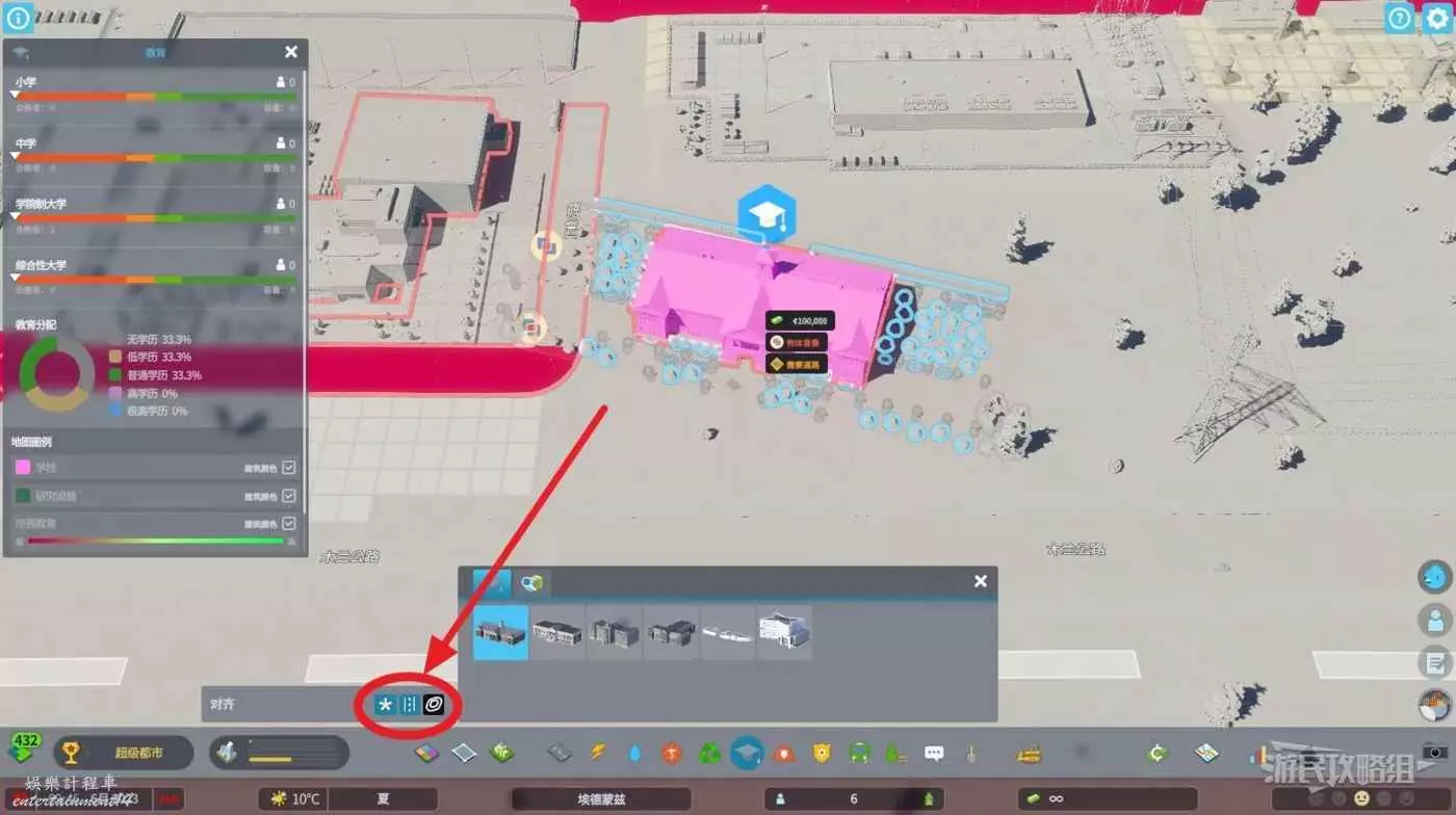 大都會 天際 2 (Cities Skylines II) 建築轉向方法 25 10 月 2023-10-25 廣告 作者:瑞破受氣包 來源:遊民星空 在沒有放置道路的情況下,選中想要放置的建築後,長按滑鼠右鍵並移動滑鼠即可為建築轉向。 如果已經建好了道路,參考下圖箭頭和紅圈位置,關閉【快速對齊路邊】或【關閉所有對齊功能】。 關閉後,按住滑鼠右鍵並拖動滑鼠即可將建築調整至自己想要放置的角度。想要自動對齊道路只需再次點擊上圖圈出的對齊按鍵開啟對齊功能即可。