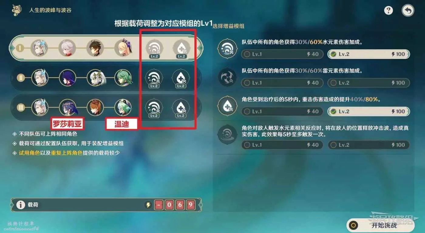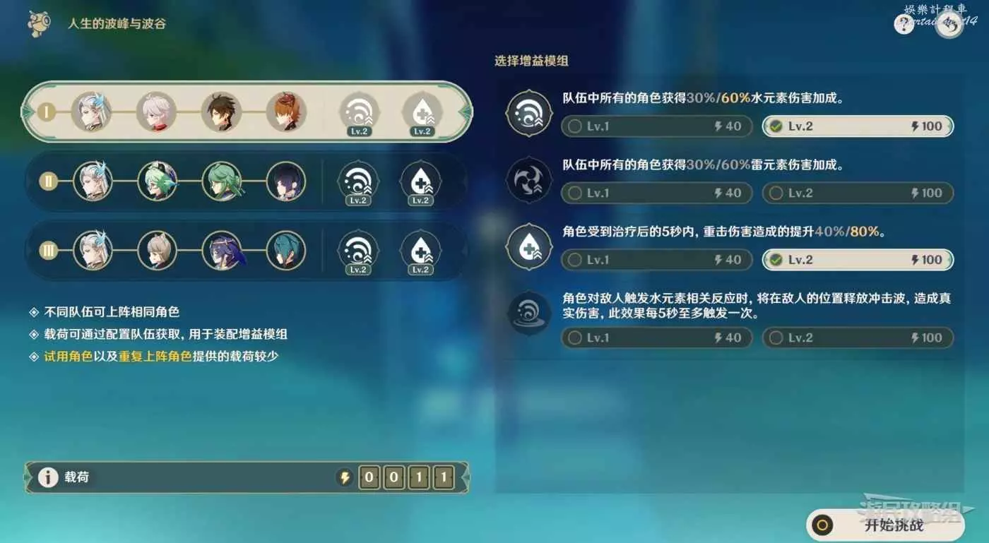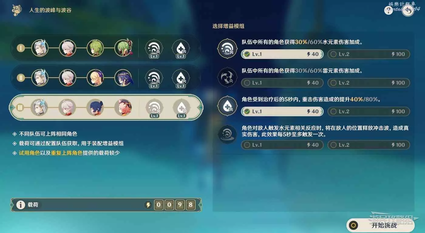 注意載荷不會影響最終的得分,只是用來兌換增益模組的,上陣的不同角色越多,載荷越大,就能選擇消耗載荷更多的增益模組,不會影響最終得分。但載荷量與角色等級有關,例如上陣90級的香菱和50級的香菱,所獲得的的載荷量是不一樣的。