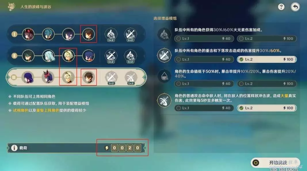 ● 每個挑戰中,活動將提供2名試用角色;隊伍中配置的自己的角色越多、角色等級越高,即可獲得更多的「載荷」用以兌換並裝配更高等級的「增益模組」。以全90級為例子,3隊有2個角色相同,載荷能吃滿增益。可以3隊用同一隊哈!
